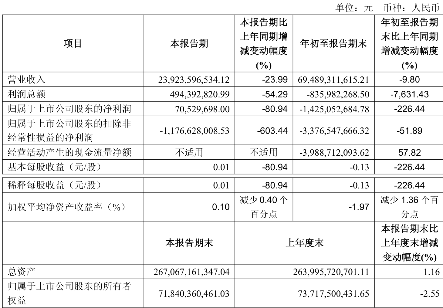 中证智能财讯金隅集团(601992)10月31日披露2025年第三季度报告。前三季度公司实现营业总收入694.89亿元,同比下降9.80%;归母净利润亏损14.25亿元,上年同期亏损4.37亿元;扣非净利润亏损33.77亿元,上年同期亏损22.23亿元;经营活动产生的现金流量净额为-39.89亿元,上年同期为-94.57亿元;报告期内,金隅集团基本每股收益为-0.13元,加权平均净资产收益率为-1.97%。