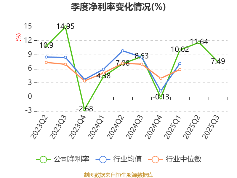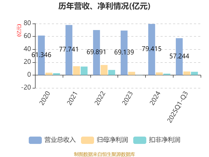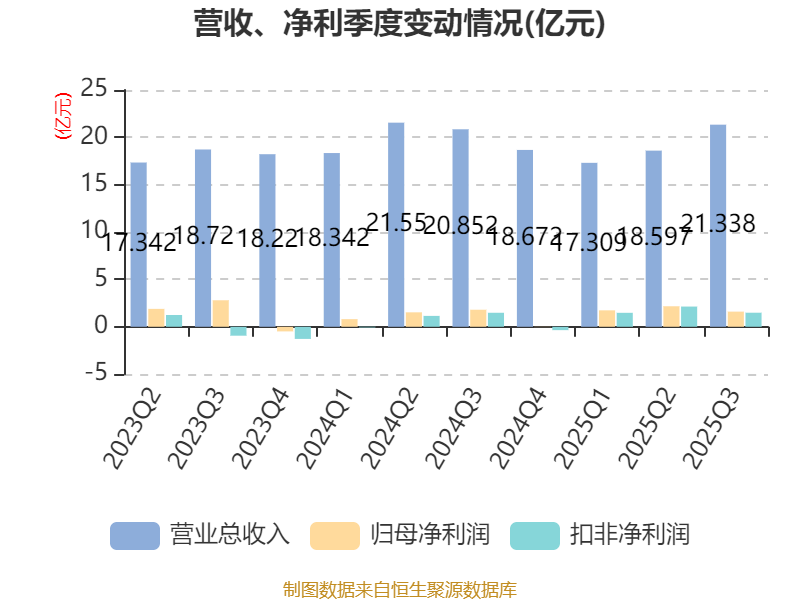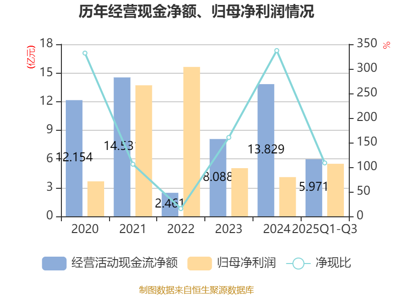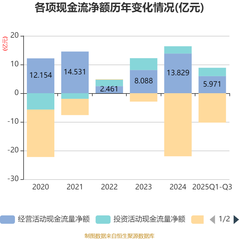 2025年前三季度,公司经营活动现金流净额为5.97亿元,同比下降52.01%;筹资活动现金流净额-10.25亿元,同比增加6.52亿元;投资活动现金流净额2.9亿元,上年同期为9723.06万元。