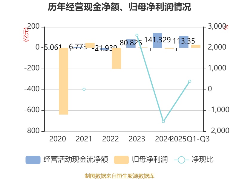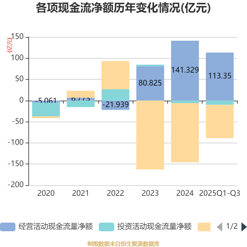2025年前三季度,公司经营活动现金流净额为113.35亿元,同比下降2.22%;筹资活动现金流净额-78.59亿元,同比增加6642.3万元;投资活动现金流净额-10.08亿元,上年同期为-13.67亿元。