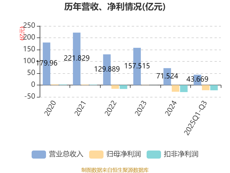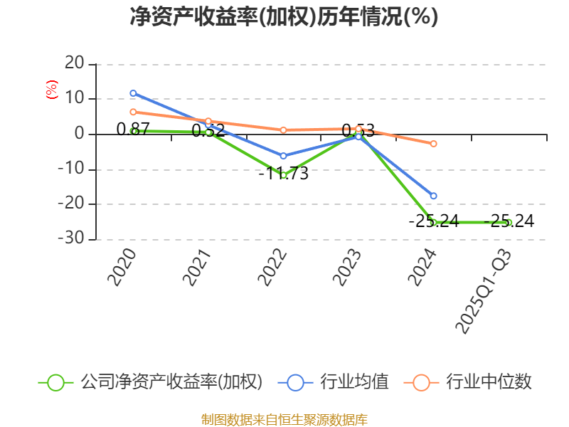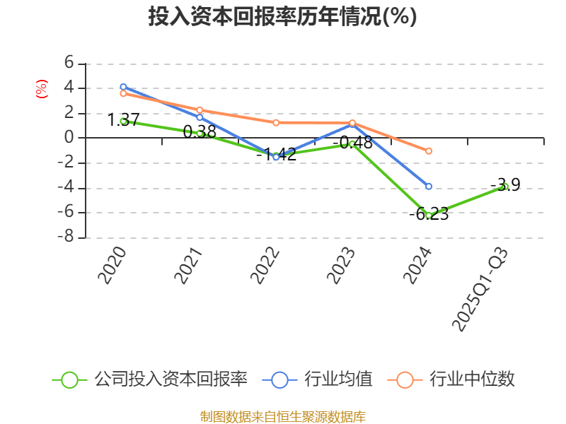 盈利能力方面, 2025年前三季度公司加权平均净资产收益率为-25.24%,同比下降17.62个百分点。公司2025年前三季度投入资本回报率为-3.9%,较上年同期下降2.96个百分点。