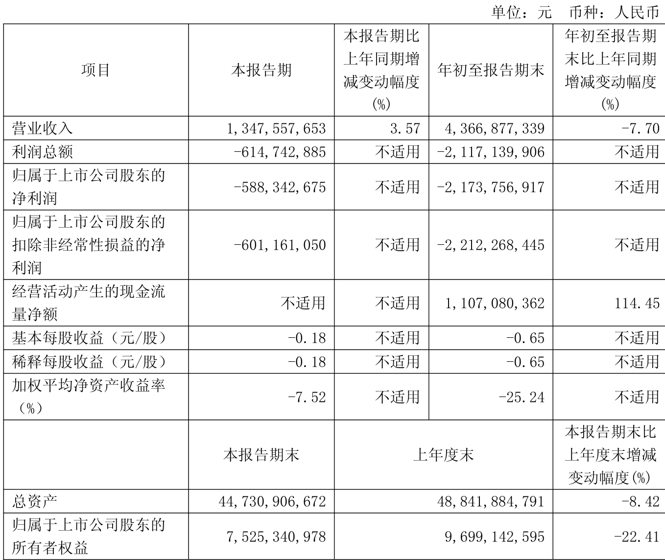 中证智能财讯北辰实业(601588)10月31日披露2025年第三季度报告。前三季度公司实现营业总收入43.67亿元,同比下降7.70%;归母净利润亏损21.74亿元,上年同期亏损9.28亿元;扣非净利润亏损22.12亿元,上年同期亏损10.02亿元;经营活动产生的现金流量净额为11.07亿元,同比增长114.45%;报告期内,北辰实业基本每股收益为-0.65元,加权平均净资产收益率为-25.24%。