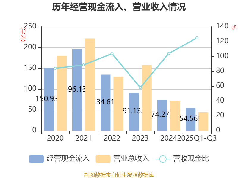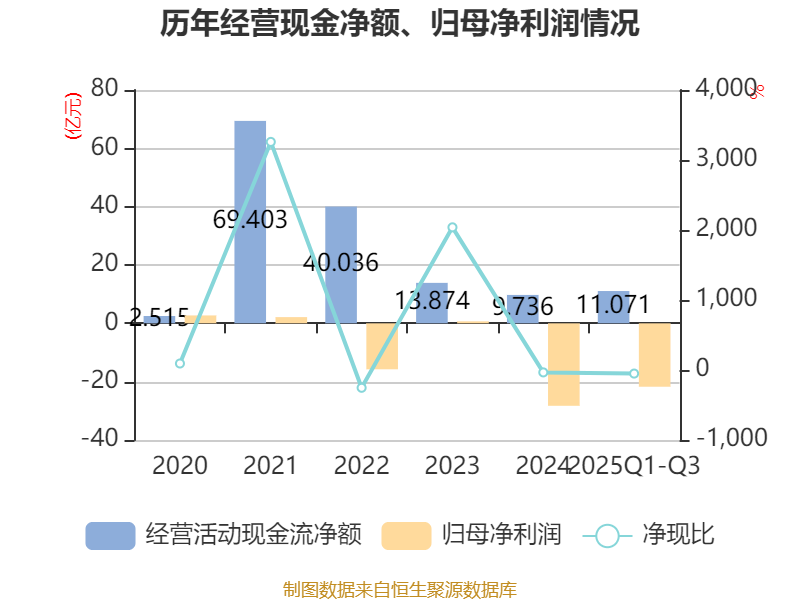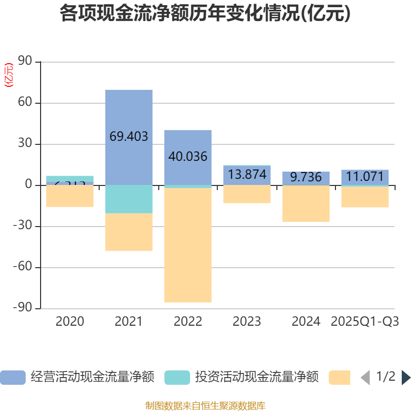 2025年前三季度,公司经营活动现金流净额为11.07亿元,同比增长114.45%;筹资活动现金流净额-15.06亿元,同比增加678.25万元;投资活动现金流净额-1.27亿元,上年同期为-70.69万元。