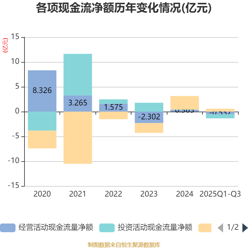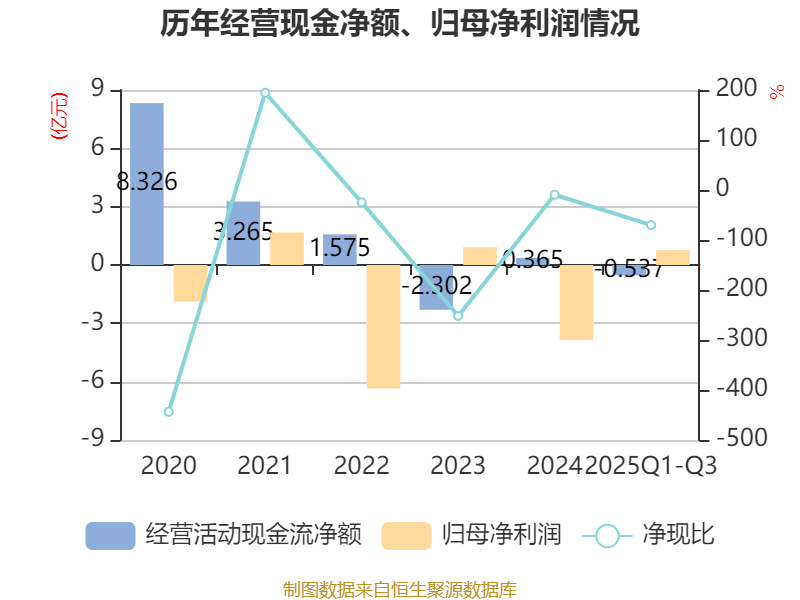 2025年前三季度,公司经营活动现金流净额为-5367.97万元,同比减少1.38亿元;筹资活动现金流净额5794.81万元,同比减少2.13亿元;投资活动现金流净额-8213.3万元,上年同期为513.19万元。