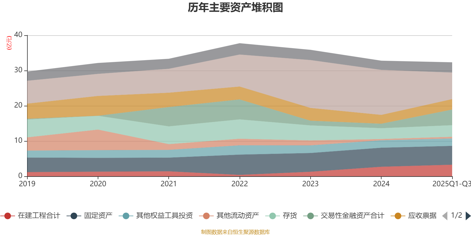 资产重大变化方面,截至2025年三季度末,公司货币资金较上年末减少40.86%,占公司总资产比重下降15.6个百分点;交易性金融资产合计较上年末增加255.6%,占公司总资产比重上升9.96个百分点;在建工程合计较上年末增加21.7%,占公司总资产比重上升1.91个百分点;应收票据及应收账款较上年末增加17.5%,占公司总资产比重上升1.46个百分点。