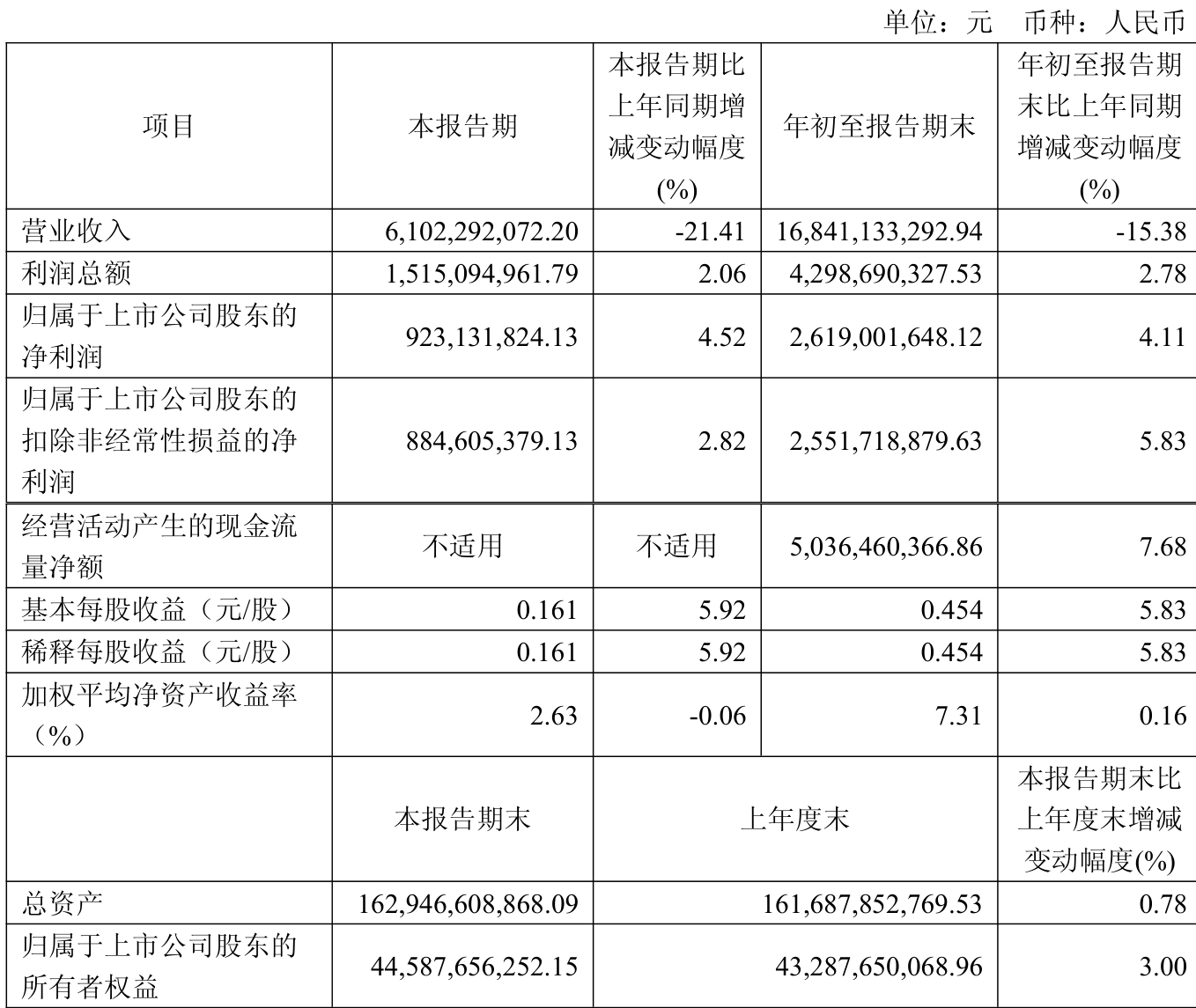 中证智能财讯山东高速(600350)10月31日披露2025年第三季度报告。前三季度公司实现营业总收入168.41亿元,同比下降15.38%;归母净利润26.19亿元,同比增长4.11%;扣非净利润25.52亿元,同比增长5.83%;经营活动产生的现金流量净额为50.36亿元,同比增长7.68%;报告期内,山东高速基本每股收益为0.454元,加权平均净资产收益率为7.31%。