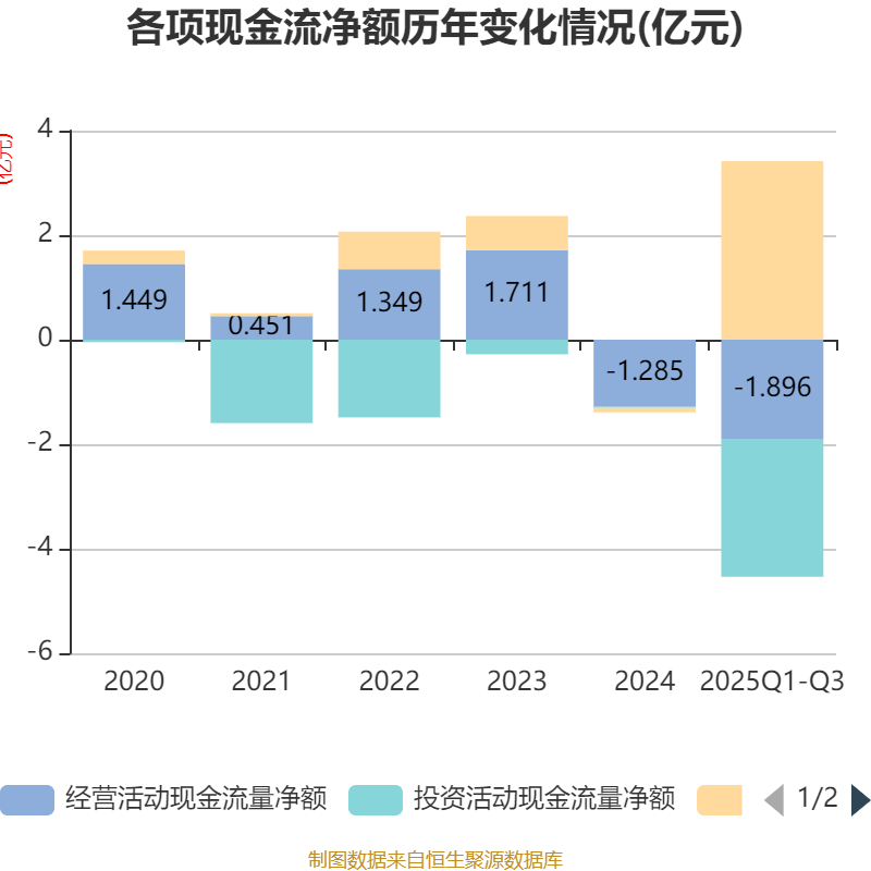 2025年前三季度,公司经营活动现金流净额为-1.9亿元,同比增加2.41亿元;筹资活动现金流净额3.42亿元,同比增加3.82亿元;投资活动现金流净额-2.64亿元,上年同期为-702.96万元。