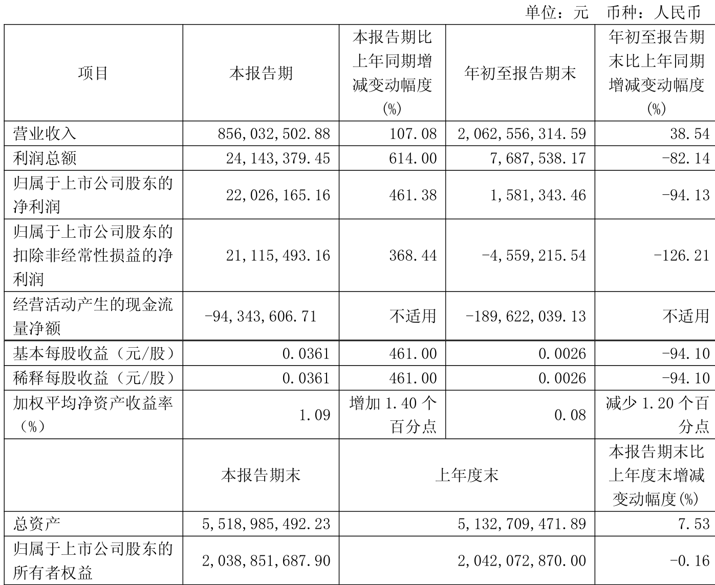中证智能财讯中材节能(603126)10月31日披露2025年第三季度报告。前三季度公司实现营业总收入20.63亿元,同比增长38.54%;归母净利润158.13万元,同比下降94.13%;扣非净利润亏损455.92万元,上年同期盈利1739.55万元;经营活动产生的现金流量净额为-1.9亿元,上年同期为-4.3亿元;报告期内,中材节能基本每股收益为0.0026元,加权平均净资产收益率为0.08%。