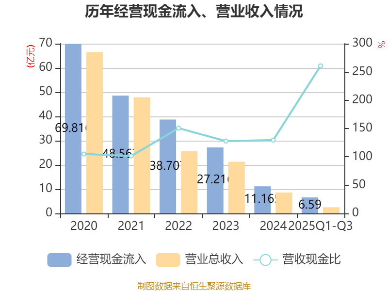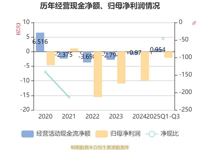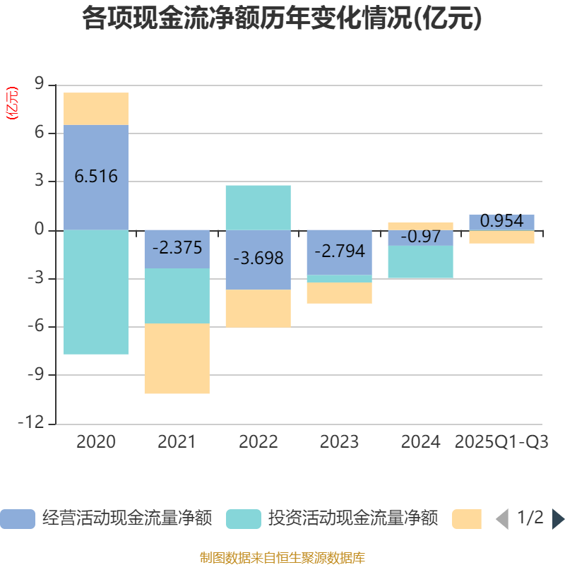 2025年前三季度,公司经营活动现金流净额为9537.73万元,同比增加2.2亿元;筹资活动现金流净额-7906.35万元,同比减少1.32亿元;投资活动现金流净额-419.32万元,上年同期为-2.02亿元。