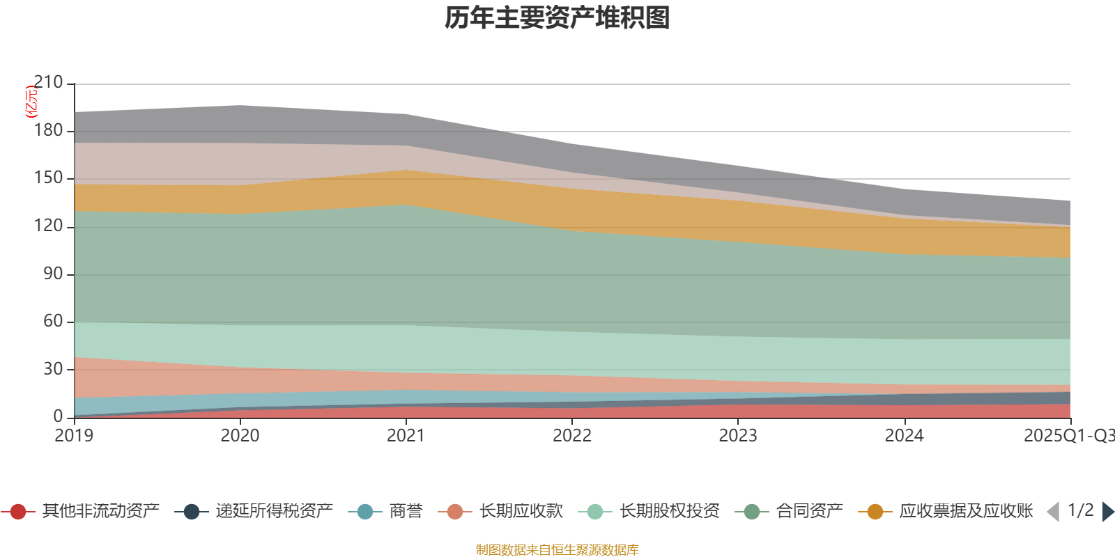 资产重大变化方面,截至2025年三季度末,公司应收票据及应收账款较上年末减少14.83%,占公司总资产比重下降1.6个百分点;长期股权投资较上年末增加1.74%,占公司总资产比重上升1.43个百分点;长期应收款较上年末减少25.35%,占公司总资产比重下降0.89个百分点;递延所得税资产较上年末增加10.01%,占公司总资产比重上升0.78个百分点。