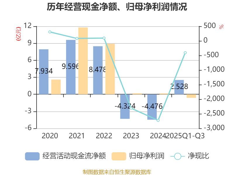 2025年前三季度,公司经营活动现金流净额为2.53亿元,同比增加5.8亿元;筹资活动现金流净额3.41亿元,同比减少12.7亿元;投资活动现金流净额2.8亿元,上年同期为-4.58亿元。