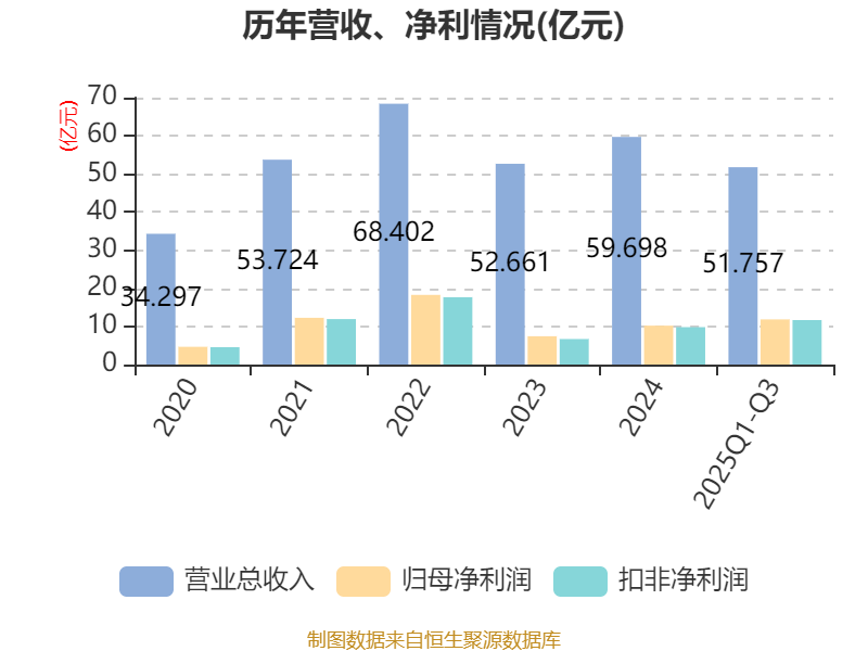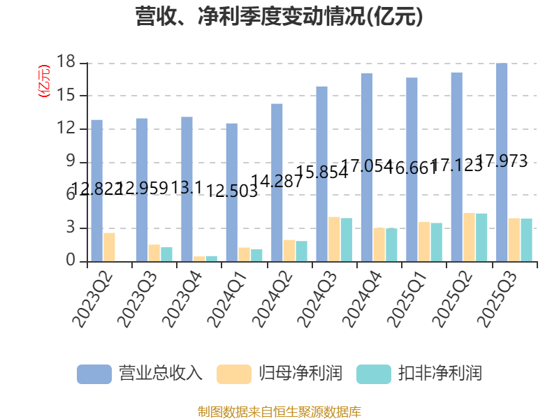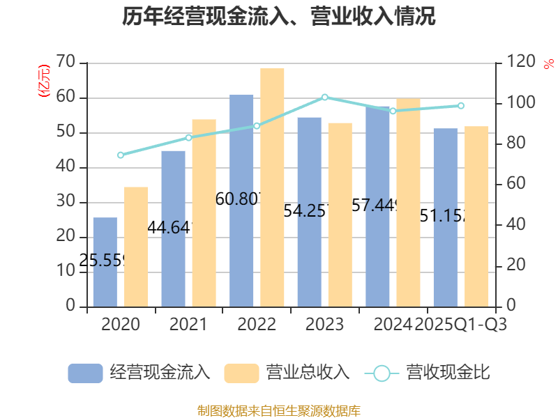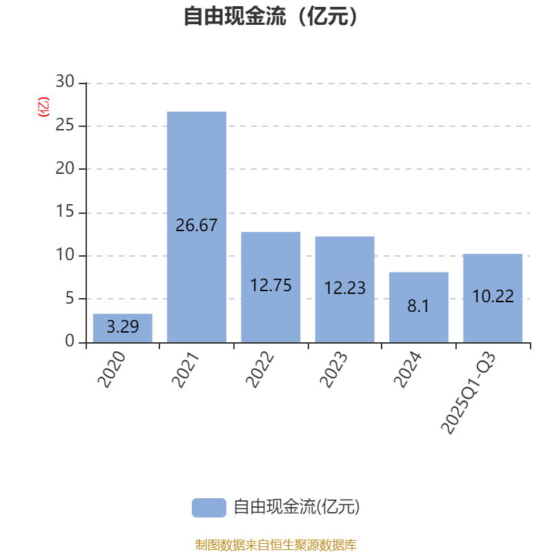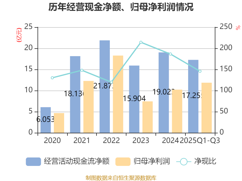 2025年前三季度,公司经营活动现金流净额为17.25亿元,同比增长18.74%;筹资活动现金流净额-6.23亿元,同比增加1.73亿元;投资活动现金流净额-5.46亿元,上年同期为-3.39亿元。