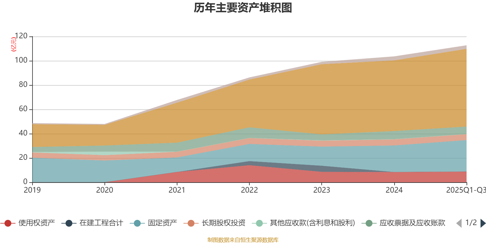 资产重大变化方面,截至2025年三季度末,公司固定资产较上年末增加18.58%,占公司总资产比重上升1.89个百分点;应收票据及应收账款较上年末减少8.55%,占公司总资产比重下降1.03个百分点;货币资金较上年末增加10.08%,占公司总资产比重上升0.65个百分点;长期股权投资较上年末减少2.54%,占公司总资产比重下降0.51个百分点。