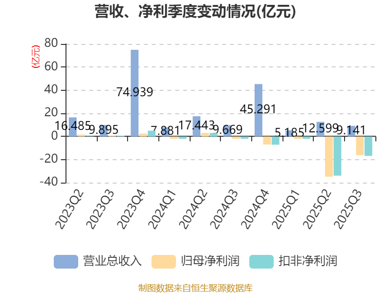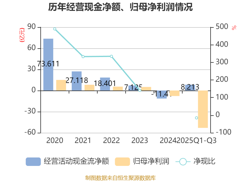 2025年前三季度,公司经营活动现金流净额为8.21亿元,同比增加34.87亿元;筹资活动现金流净额15.23亿元,同比增加46.29亿元;投资活动现金流净额-7.44亿元,上年同期为14.64亿元。