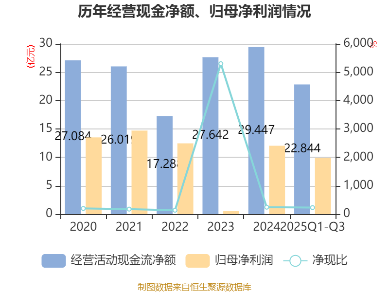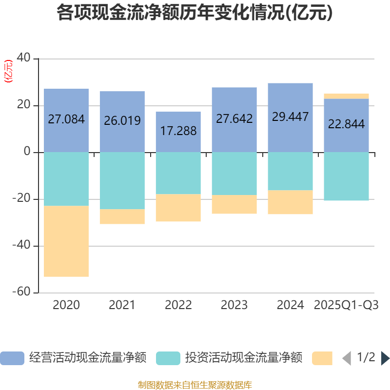 2025年前三季度,公司经营活动现金流净额为22.84亿元,同比增长2.86%;筹资活动现金流净额2.15亿元,同比增加9.38亿元;投资活动现金流净额-20.7亿元,上年同期为-11.78亿元。