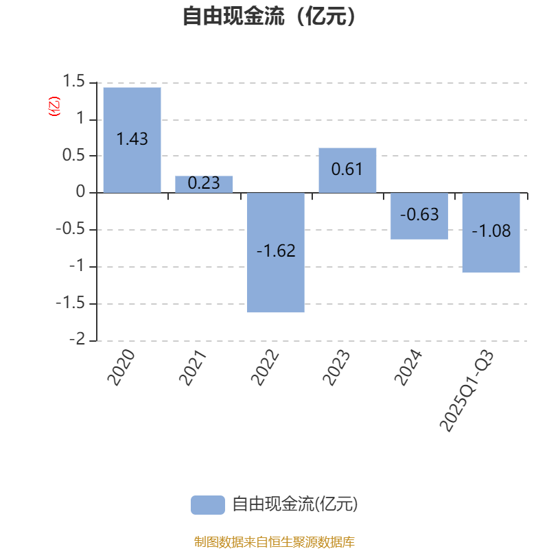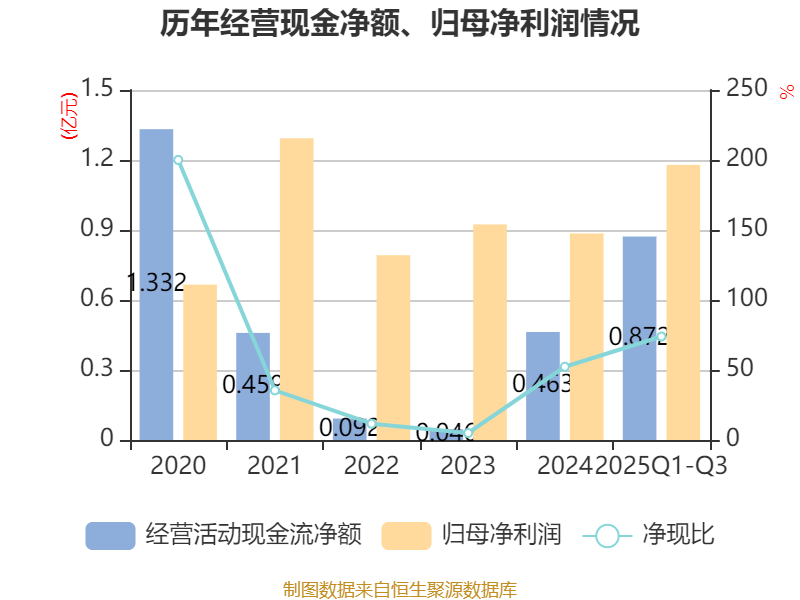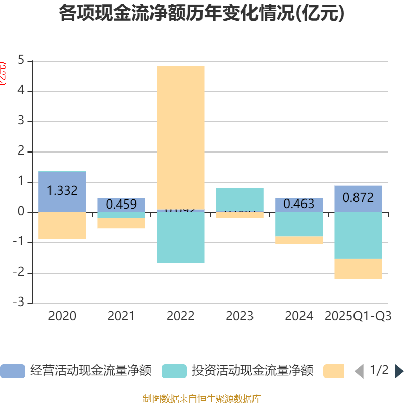 2025年前三季度,公司经营活动现金流净额为8716.4万元,同比增加1.18亿元;筹资活动现金流净额-6728.17万元,同比减少3880.51万元;投资活动现金流净额-1.53亿元,上年同期为-6022.92万元。