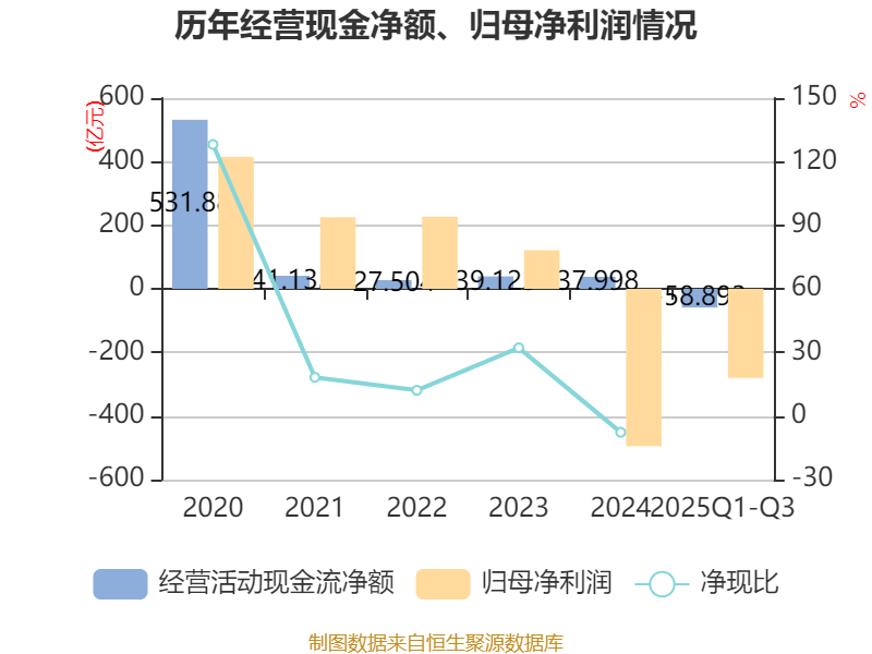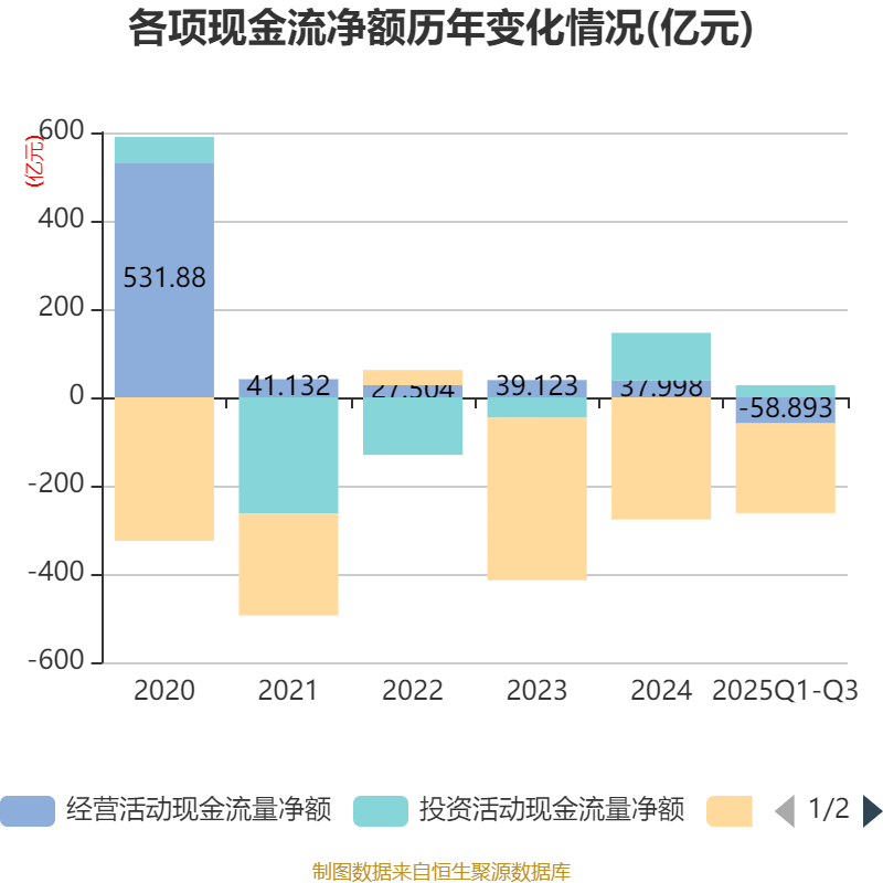 2025年前三季度,公司经营活动现金流净额为-58.89亿元,同比减少10.42亿元;筹资活动现金流净额-203.21亿元,同比增加8479.52万元;投资活动现金流净额27.57亿元,上年同期为56.32亿元。