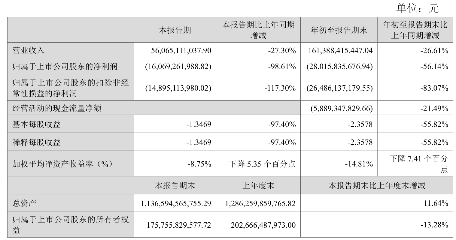 中证智能财讯万科A(000002)10月31日披露2025年第三季度报告。前三季度公司实现营业总收入1613.88亿元,同比下降26.61%;归母净利润亏损280.16亿元,上年同期亏损179.43亿元;扣非净利润亏损264.86亿元,上年同期亏损144.68亿元;经营活动产生的现金流量净额为-58.89亿元,上年同期为-48.48亿元;报告期内,万科A基本每股收益为-2.3578元,加权平均净资产收益率为-14.81%。