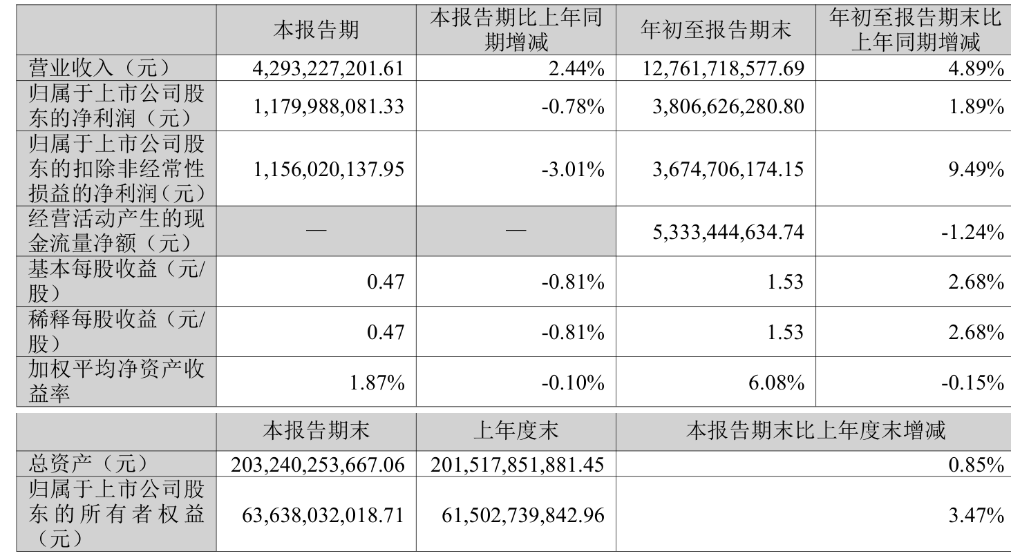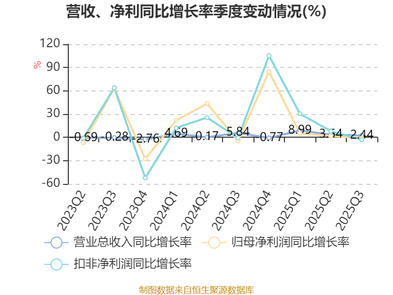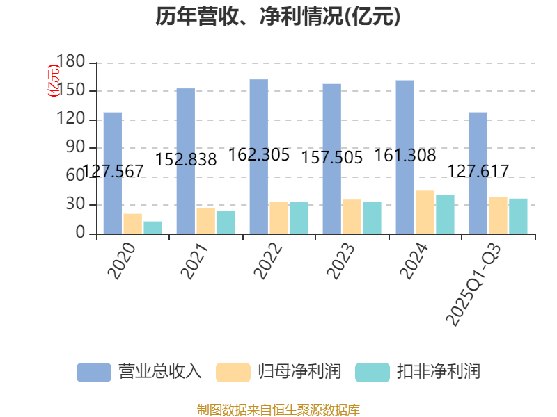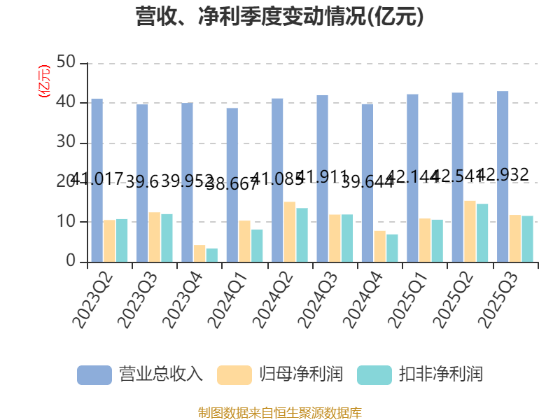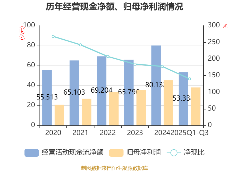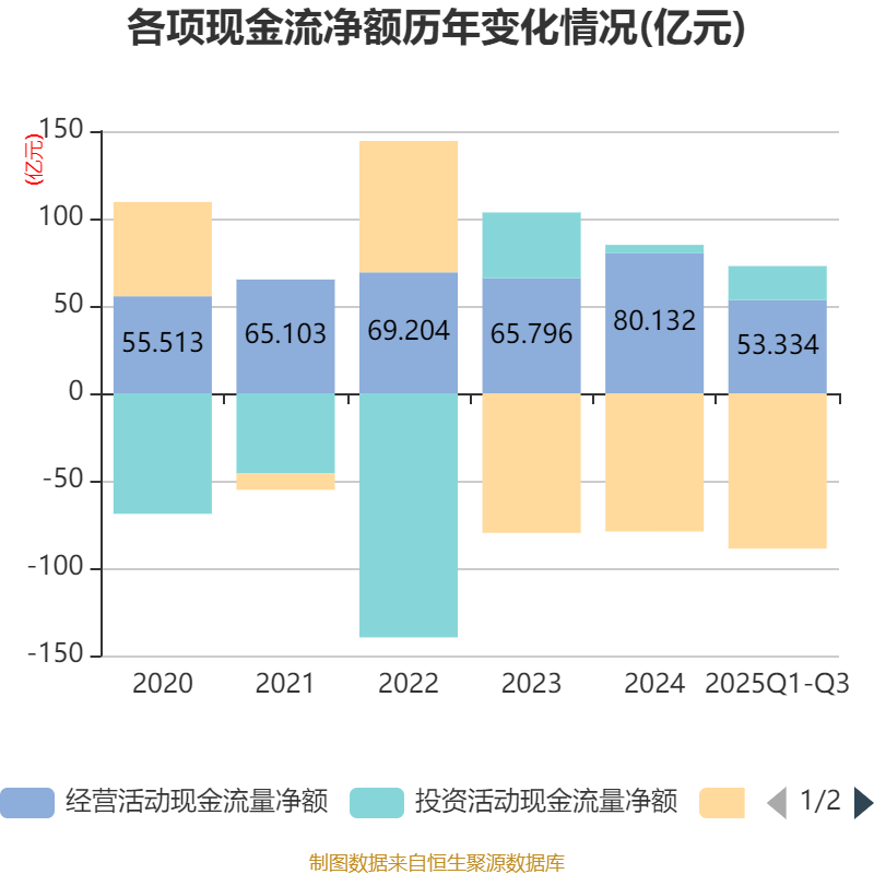 2025年前三季度,公司经营活动现金流净额为53.33亿元,同比下降1.24%;筹资活动现金流净额-88.86亿元,同比减少16.94亿元;投资活动现金流净额19.44亿元,上年同期为13.07亿元。