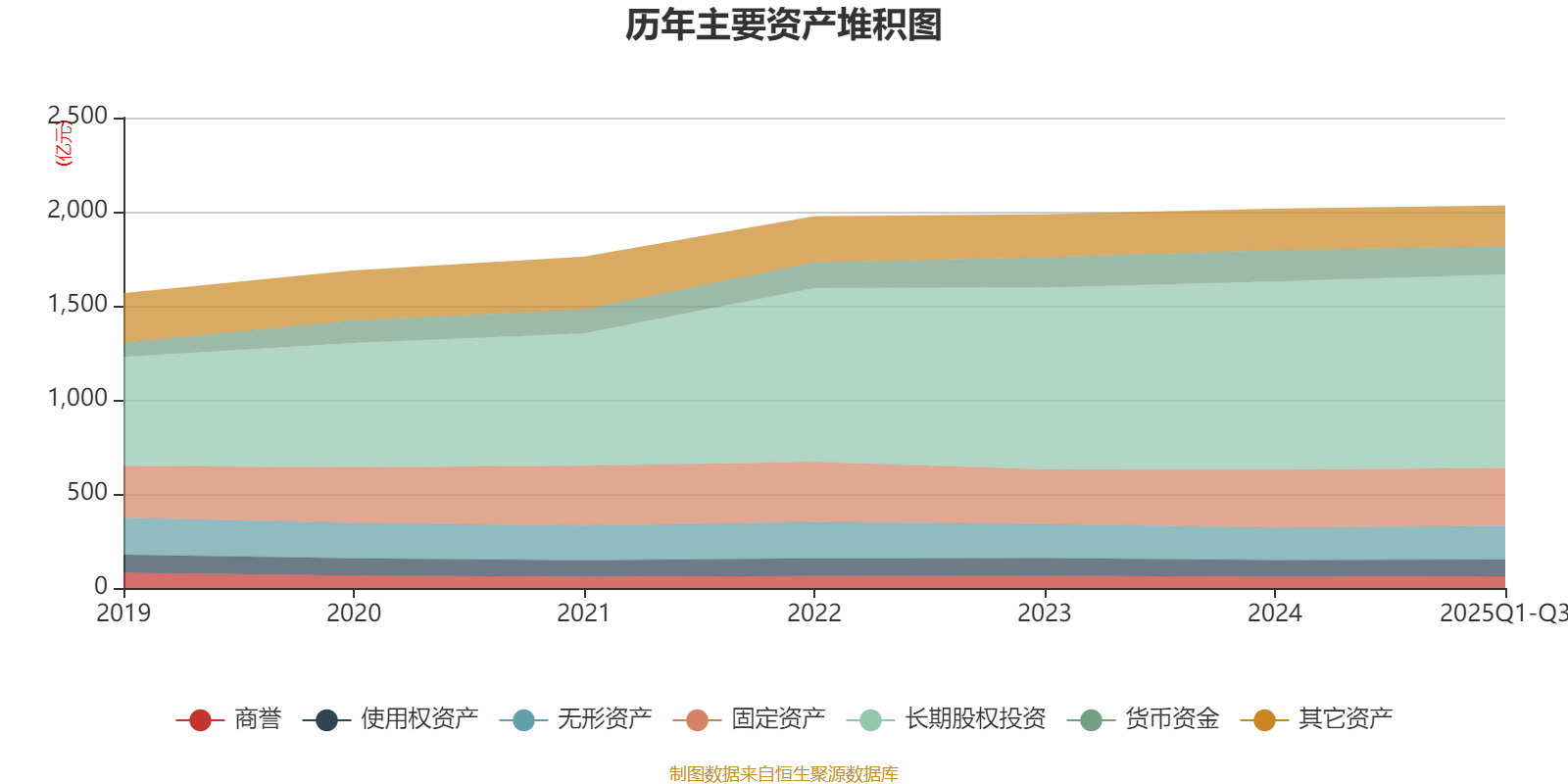 资产重大变化方面,截至2025年三季度末,公司长期股权投资较上年末增加2.81%,占公司总资产比重上升0.96个百分点;货币资金较上年末减少9.68%,占公司总资产比重下降0.86个百分点;应收票据及应收账款较上年末增加63.66%,占公司总资产比重上升0.45个百分点;交易性金融资产合计较上年末减少14.14%,占公司总资产比重下降0.42个百分点。
