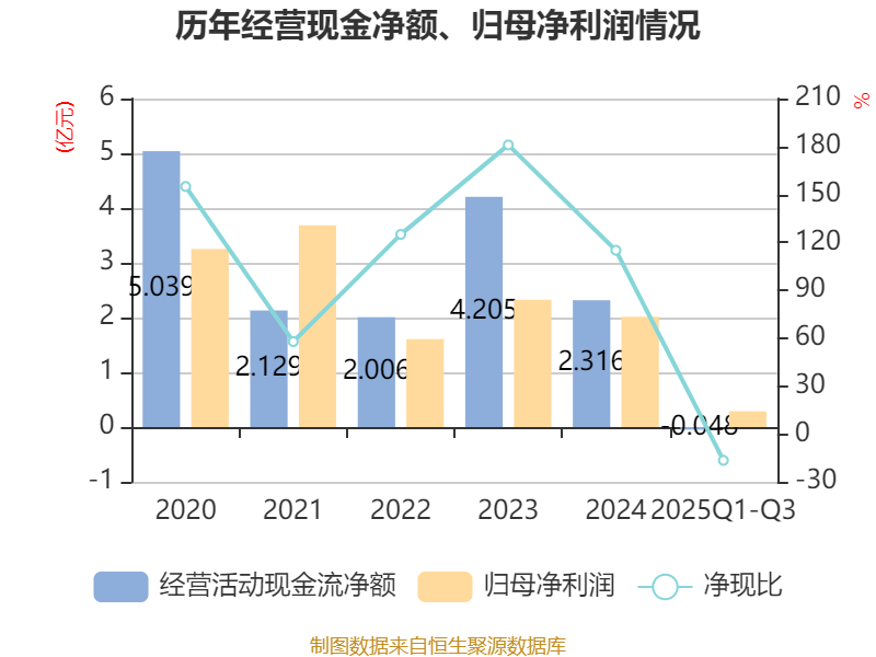 2025年前三季度,公司经营活动现金流净额为-477.78万元,同比减少1.89亿元;筹资活动现金流净额-7808.85万元,同比减少2172.67万元;投资活动现金流净额-1.73亿元,上年同期为-2.4亿元。