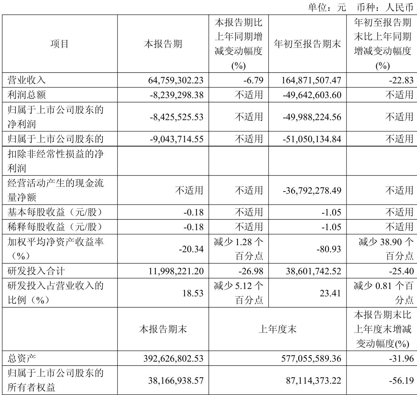 中证智能财讯青云科技(688316)10月31日披露2025年第三季度报告。前三季度公司实现营业总收入1.65亿元,同比下降22.83%;归母净利润亏损4998.82万元,上年同期亏损6275.86万元;扣非净利润亏损5105.01万元,上年同期亏损6913.26万元;经营活动产生的现金流量净额为-3679.23万元,上年同期为-2026.92万元;报告期内,青云科技基本每股收益为-1.05元,加权平均净资产收益率为-80.93%。