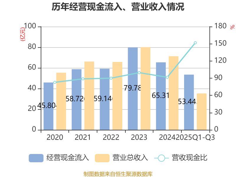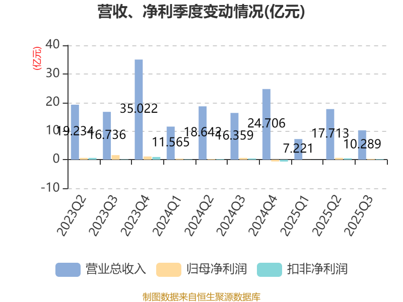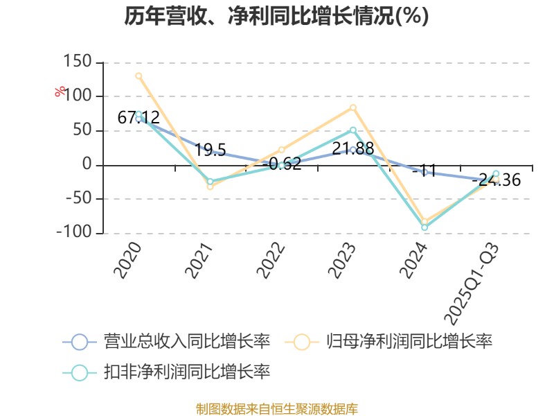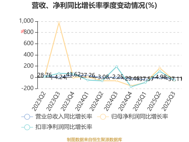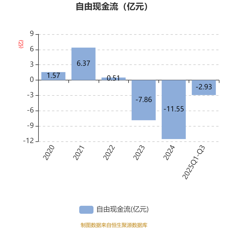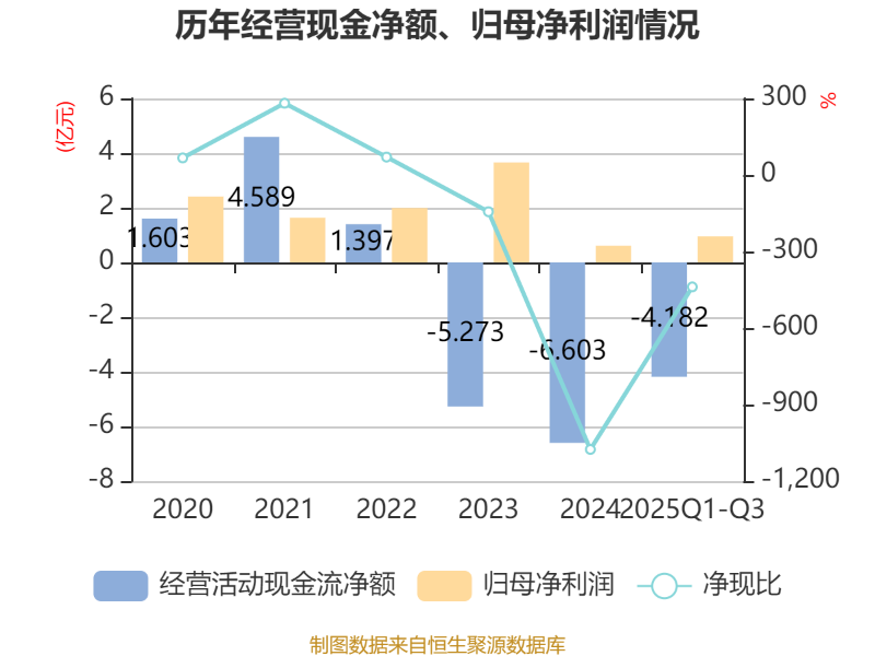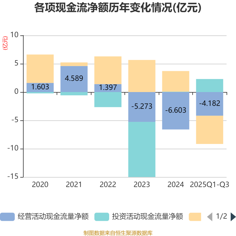 2025年前三季度,公司经营活动现金流净额为-4.18亿元,同比增加11亿元;筹资活动现金流净额-4.99亿元,同比减少10.51亿元;投资活动现金流净额2.3亿元,上年同期为-6167.85万元。