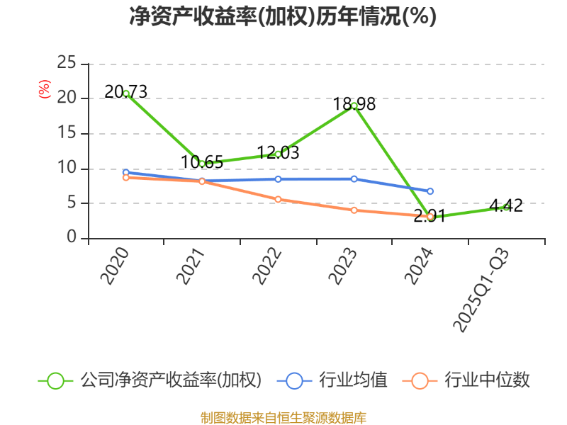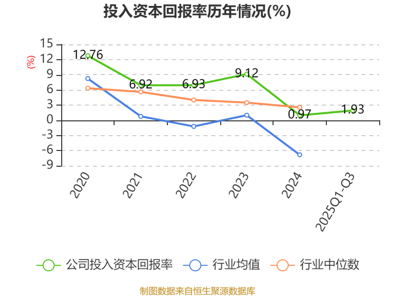 盈利能力方面, 2025年前三季度公司加权平均净资产收益率为4.42%,同比下降1.19个百分点。公司2025年前三季度投入资本回报率为1.93%,较上年同期下降0.8个百分点。