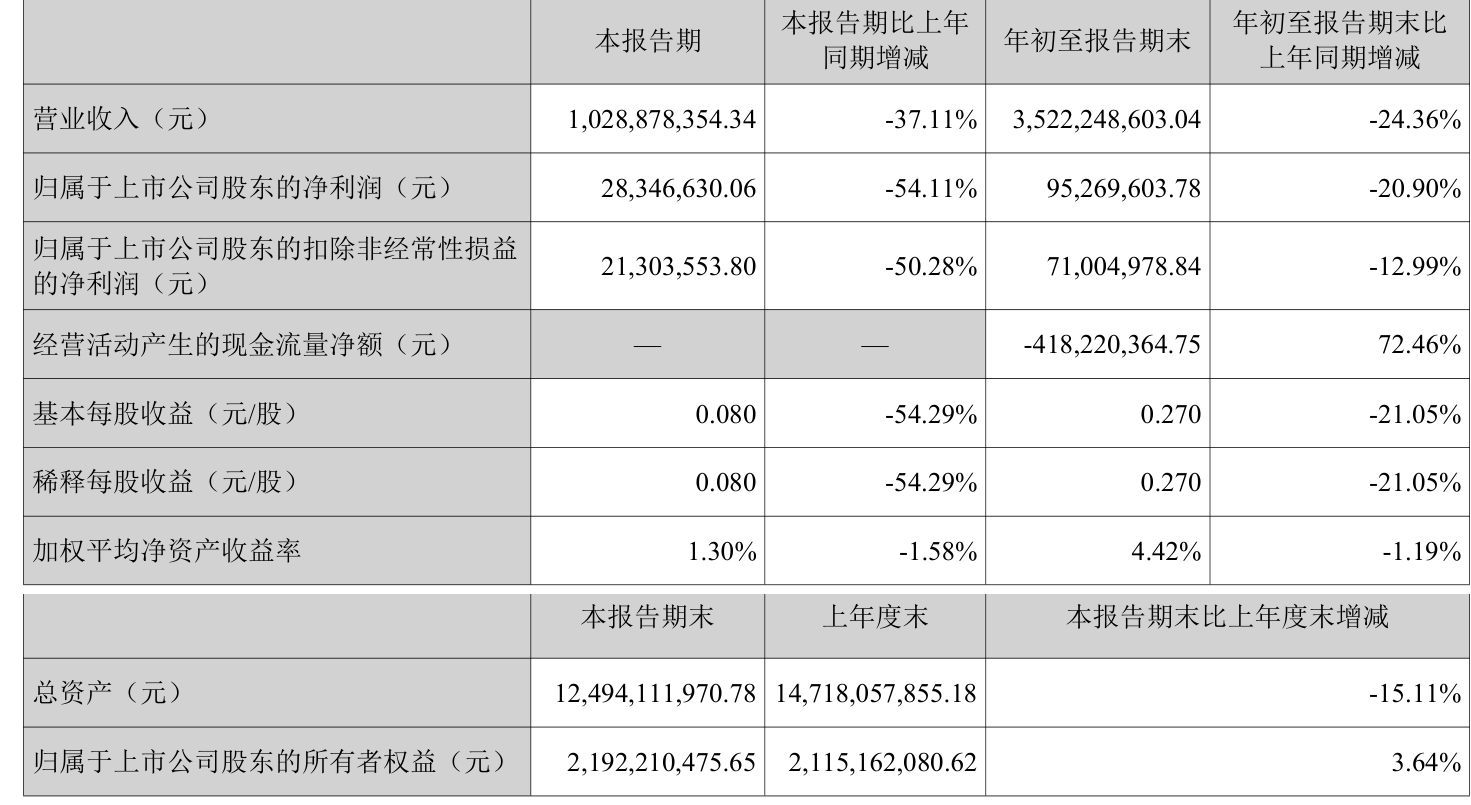 中证智能财讯高新发展(000628)10月31日披露2025年第三季度报告。前三季度公司实现营业总收入35.22亿元,同比下降24.36%;归母净利润9526.96万元,同比下降20.90%;扣非净利润7100.5万元,同比下降12.99%;经营活动产生的现金流量净额为-4.18亿元,上年同期为-15.19亿元;报告期内,高新发展基本每股收益为0.27元,加权平均净资产收益率为4.42%。