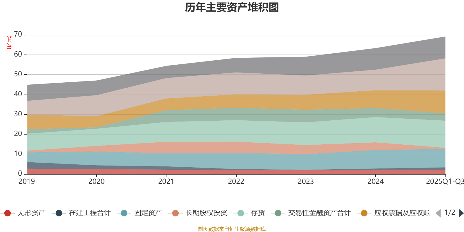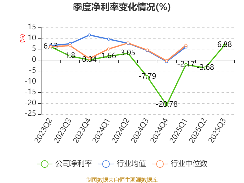 资产重大变化方面,截至2025年三季度末,公司货币资金较上年末增加56.29%,占公司总资产比重上升7.05个百分点;长期股权投资较上年末减少85.51%,占公司总资产比重下降5.24个百分点;应收票据及应收账款较上年末增加27.48%,占公司总资产比重上升2.38个百分点;交易性金融资产合计较上年末减少17.72%,占公司总资产比重下降1.76个百分点。