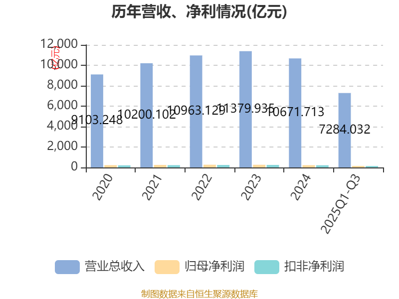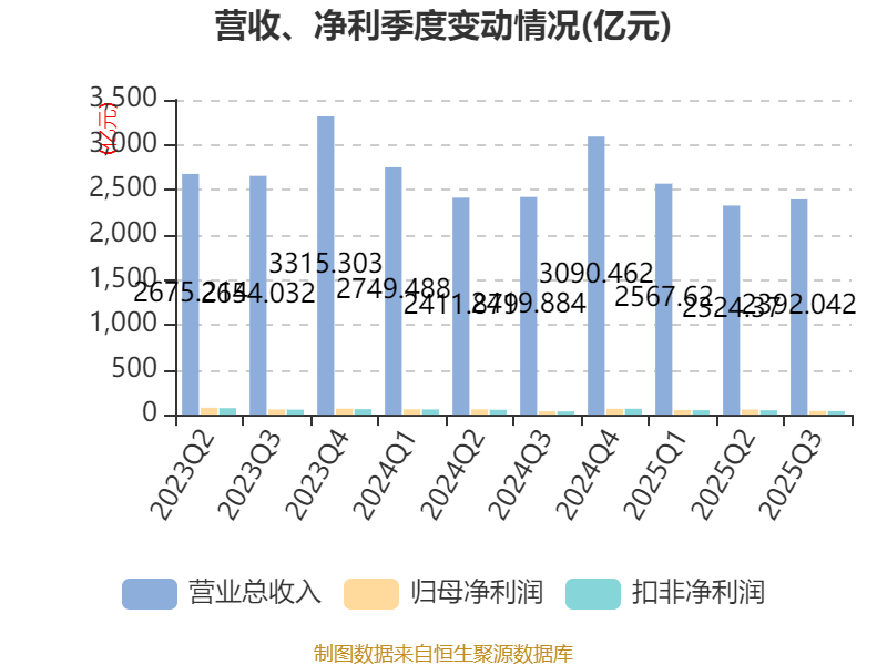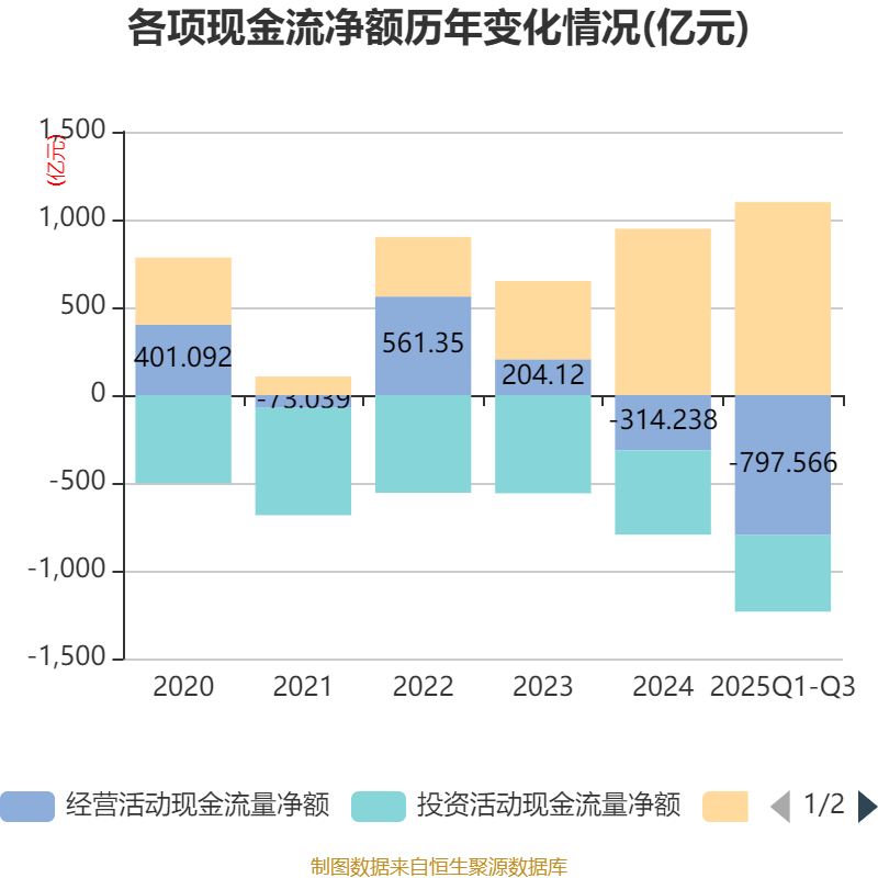 2025年前三季度,公司经营活动现金流净额为-797.57亿元,同比增加92.61亿元;筹资活动现金流净额1098.99亿元,同比减少68.74亿元;投资活动现金流净额-435.59亿元,上年同期为-367.08亿元。