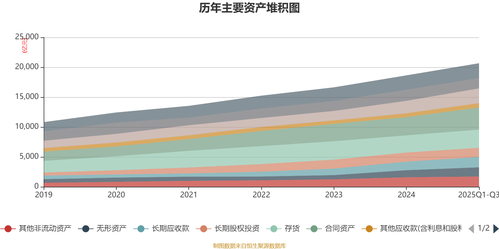 资产重大变化方面,截至2025年三季度末,公司货币资金较上年末减少7.08%,占公司总资产比重下降1.62个百分点;合同资产较上年末增加21.27%,占公司总资产比重上升1.53个百分点;无形资产较上年末增加31.72%,占公司总资产比重上升1.18个百分点;长期股权投资较上年末减少0.93%,占公司总资产比重下降0.88个百分点。