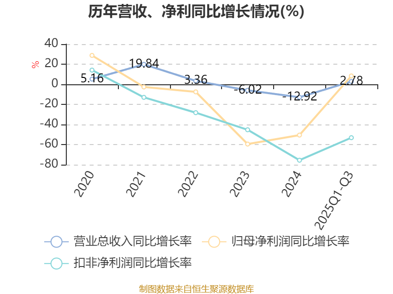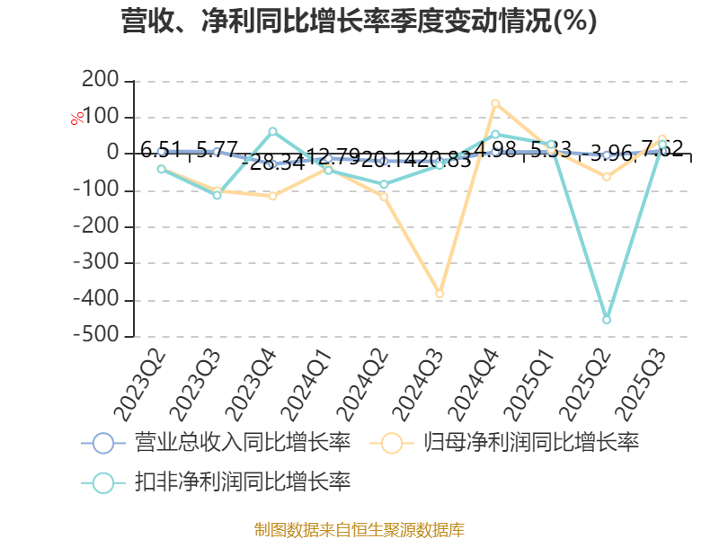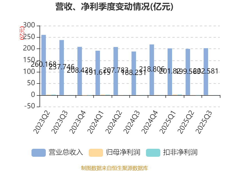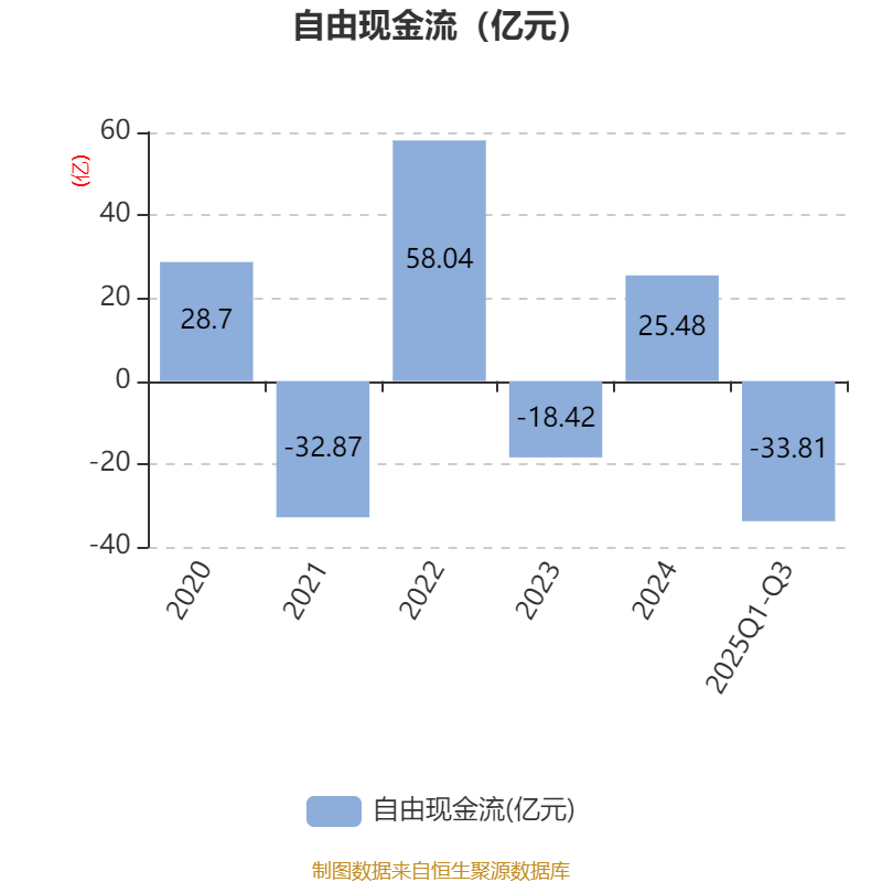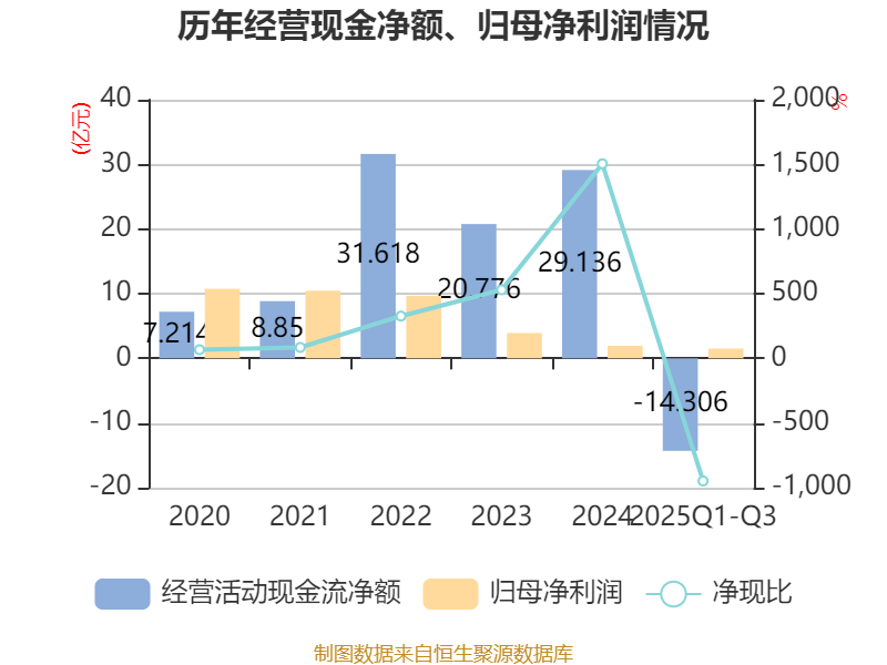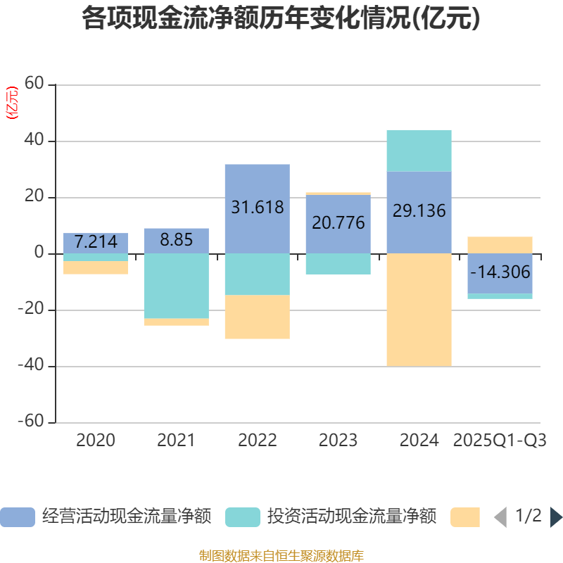 2025年前三季度,公司经营活动现金流净额为-14.31亿元,同比增加6.71亿元;筹资活动现金流净额5.9亿元,同比减少2623.82万元;投资活动现金流净额-1.9亿元,上年同期为-2.81亿元。