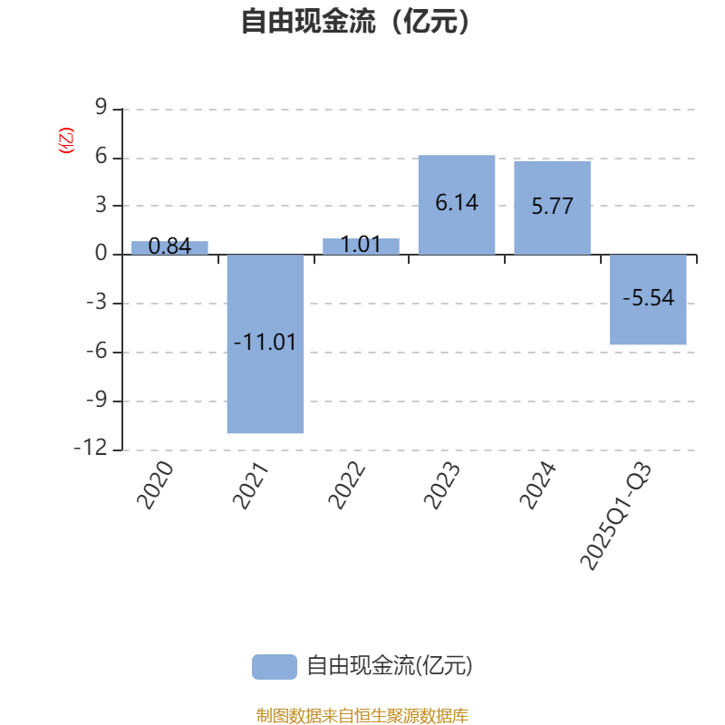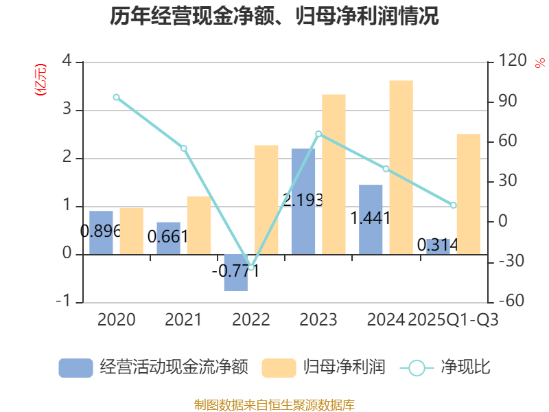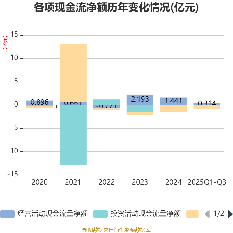 2025年前三季度,公司经营活动现金流净额为3141.47万元,同比下降84.51%;筹资活动现金流净额-8066.44万元,同比增加2708.8万元;投资活动现金流净额311.59万元,上年同期为-9080.01万元。