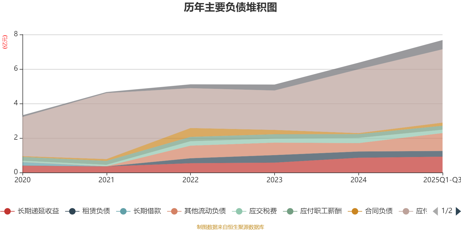 负债重大变化方面,截至2025年三季度末,公司其他流动负债较上年末增加112.53%,占公司总资产比重上升1.46个百分点;应付票据及应付账款较上年末增加14.86%,占公司总资产比重上升0.55个百分点;应交税费较上年末减少34.1%,占公司总资产比重下降0.38个百分点;合同负债较上年末增加236.93%,占公司总资产比重上升0.35个百分点。