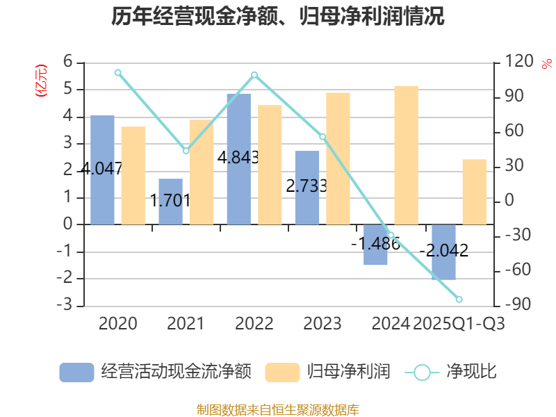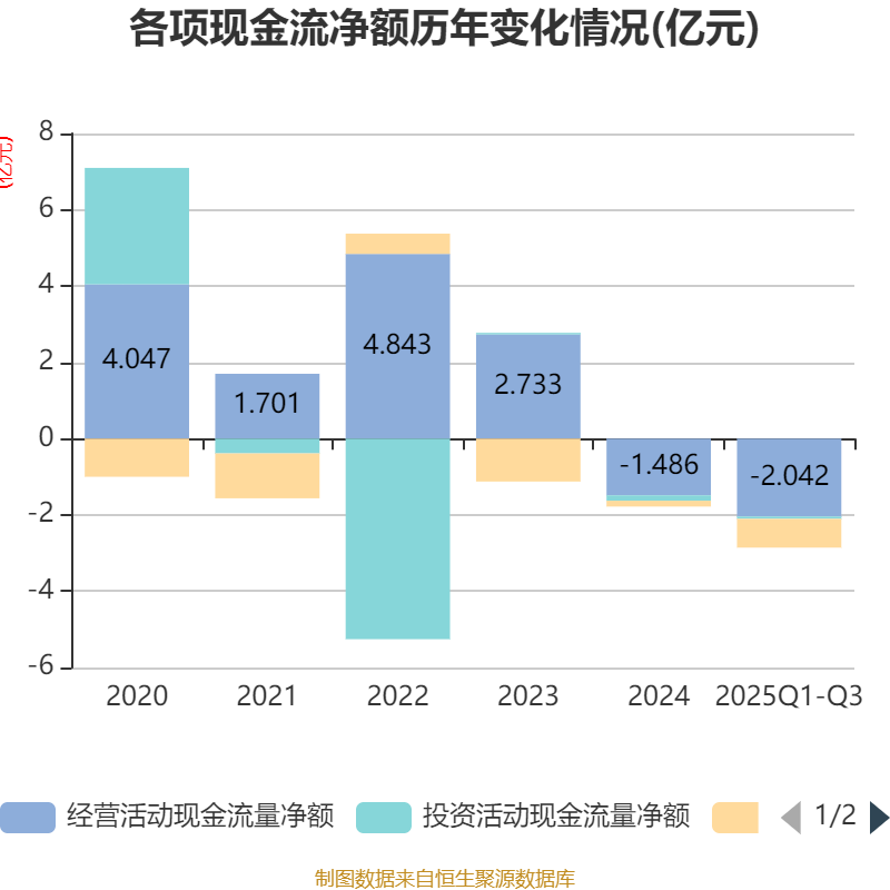 2025年前三季度,公司经营活动现金流净额为-2.04亿元,同比增加2.92亿元;筹资活动现金流净额-7547.57万元,同比减少6672.66万元;投资活动现金流净额-601.89万元,上年同期为-1435.5万元。