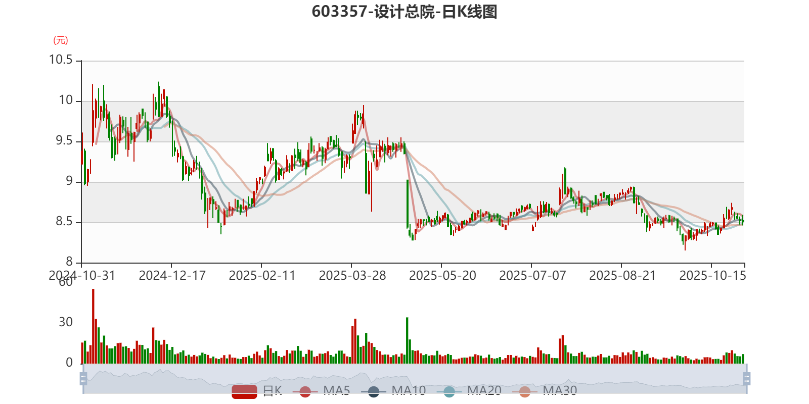 中证智能财讯设计总院(603357)10月31日披露2025年第三季度报告。前三季度公司实现营业总收入18.63亿元,同比下降18.77%;归母净利润2.42亿元,同比下降23.13%;扣非净利润2.14亿元,同比下降30.27%;经营活动产生的现金流量净额为-2.04亿元,上年同期为-4.96亿元;报告期内,设计总院基本每股收益为0.44元,加权平均净资产收益率为6.33%。