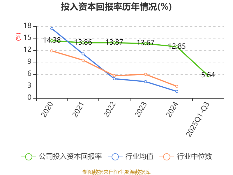 盈利能力方面, 2025年前三季度公司加权平均净资产收益率为6.33%,同比下降2.48个百分点。公司2025年前三季度投入资本回报率为5.64%,较上年同期下降2.44个百分点。