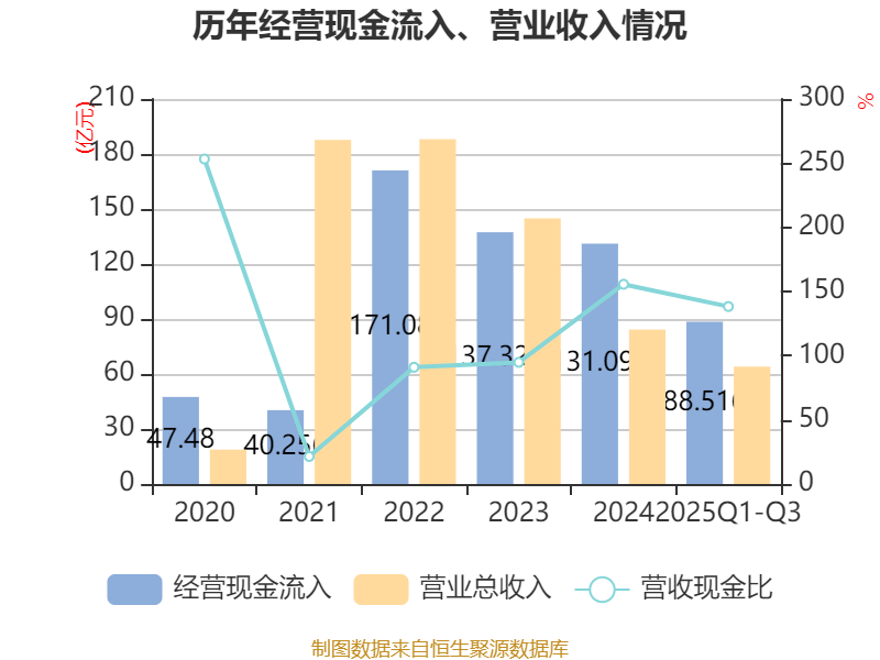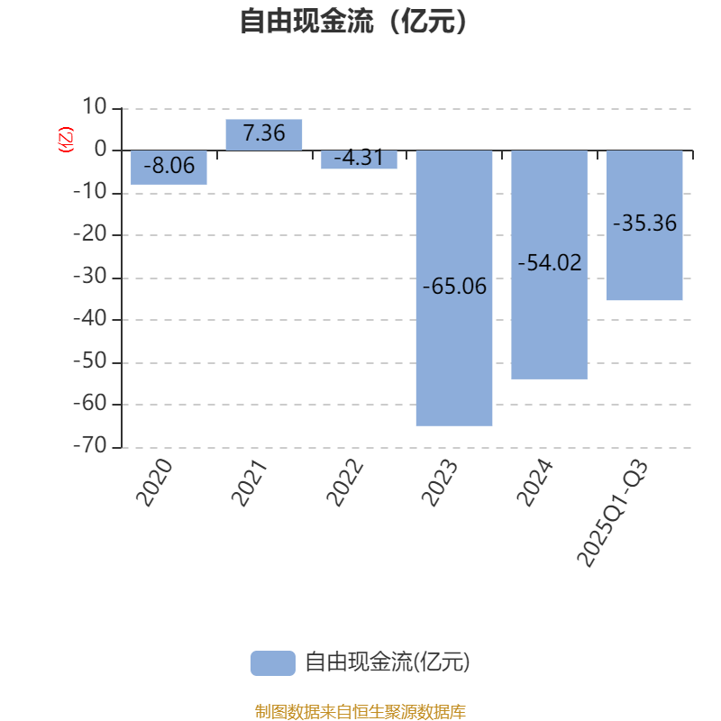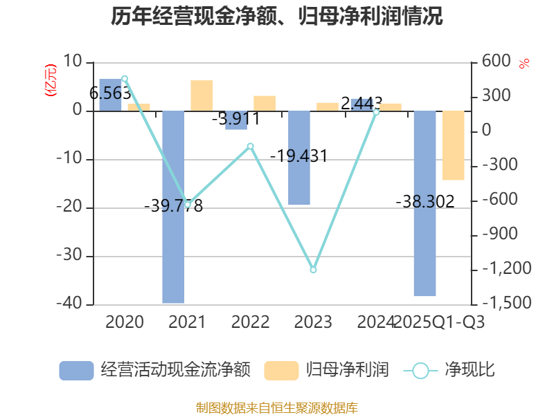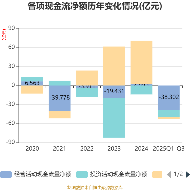 2025年前三季度,公司经营活动现金流净额为-38.3亿元,同比减少7.73亿元;筹资活动现金流净额-3.34亿元,同比减少43.01亿元;投资活动现金流净额-11.54亿元,上年同期为-4668.65万元。