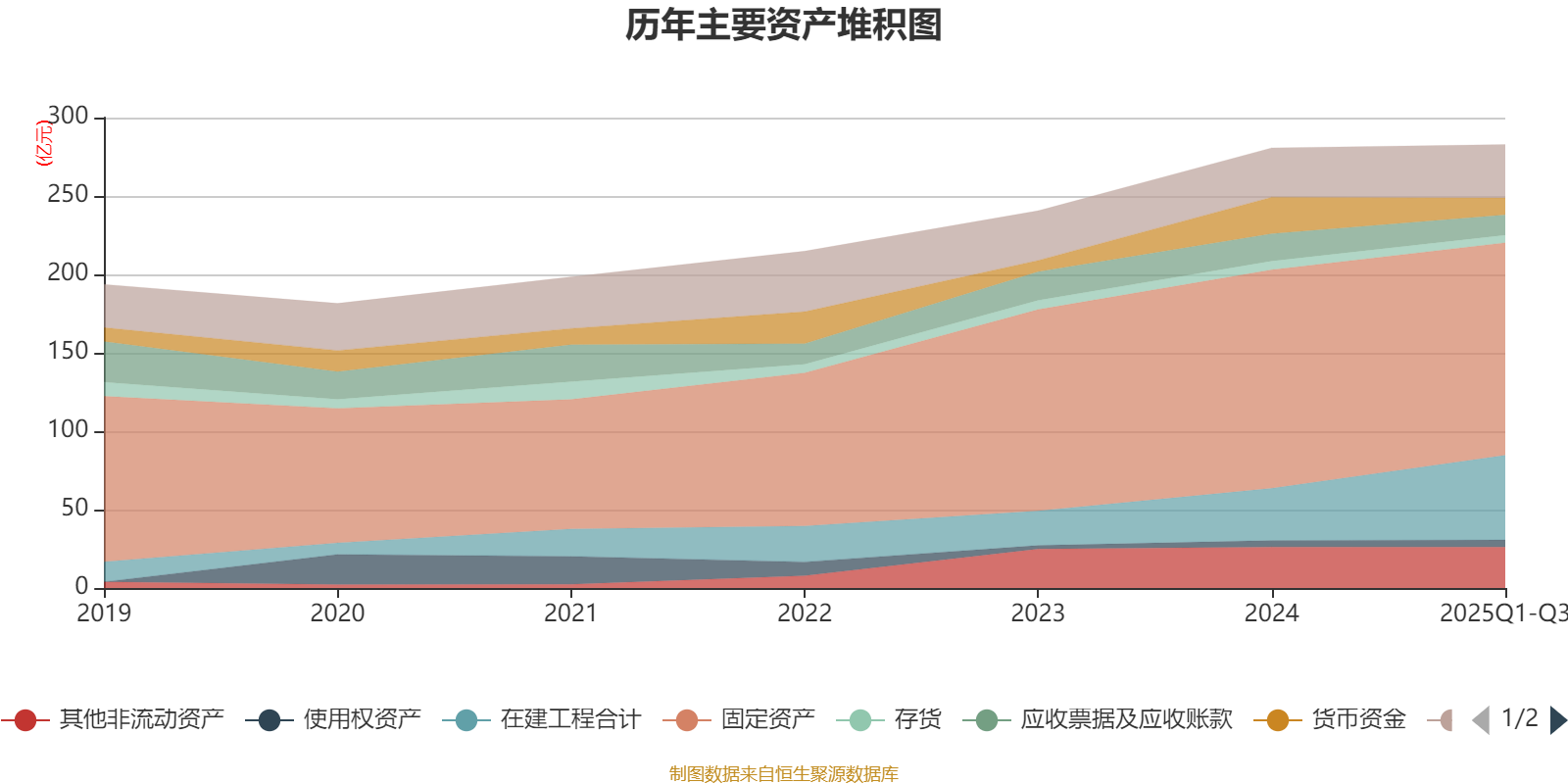 资产重大变化方面,截至2025年三季度末,公司在建工程合计较上年末增加62.53%,占公司总资产比重上升7.27个百分点;货币资金较上年末减少53.88%,占公司总资产比重下降4.51个百分点;固定资产较上年末减少2.78%,占公司总资产比重下降1.74个百分点;应收票据及应收账款较上年末减少25.64%,占公司总资产比重下降1.63个百分点。
