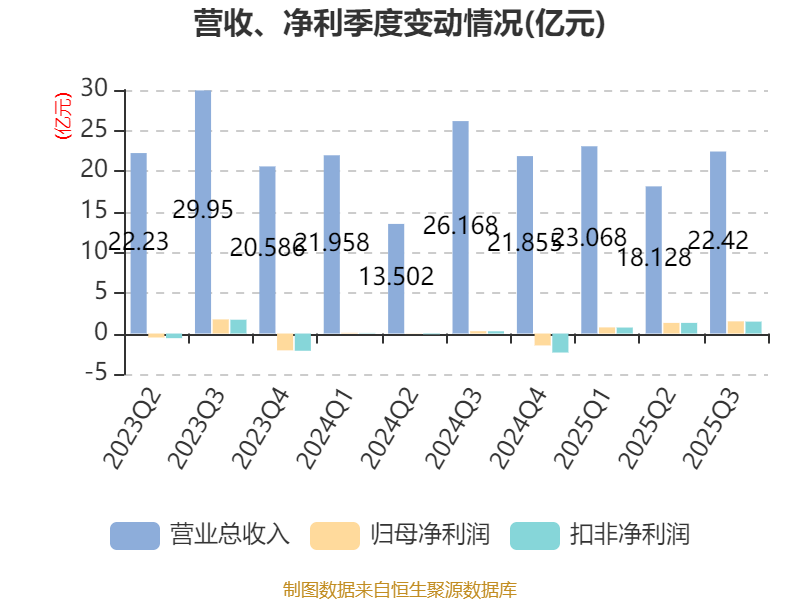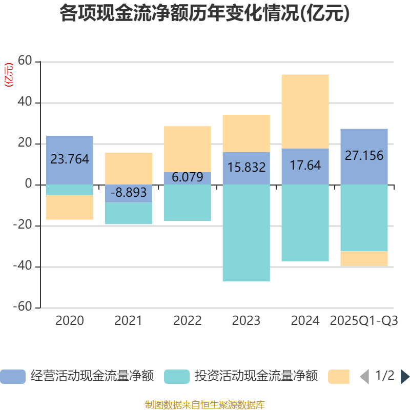2025年前三季度,公司经营活动现金流净额为27.16亿元,同比增长45.66%;筹资活动现金流净额-7.16亿元,同比减少12.4亿元;投资活动现金流净额-32.58亿元,上年同期为-18.09亿元。
