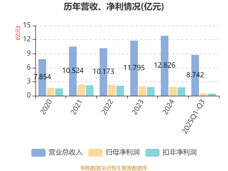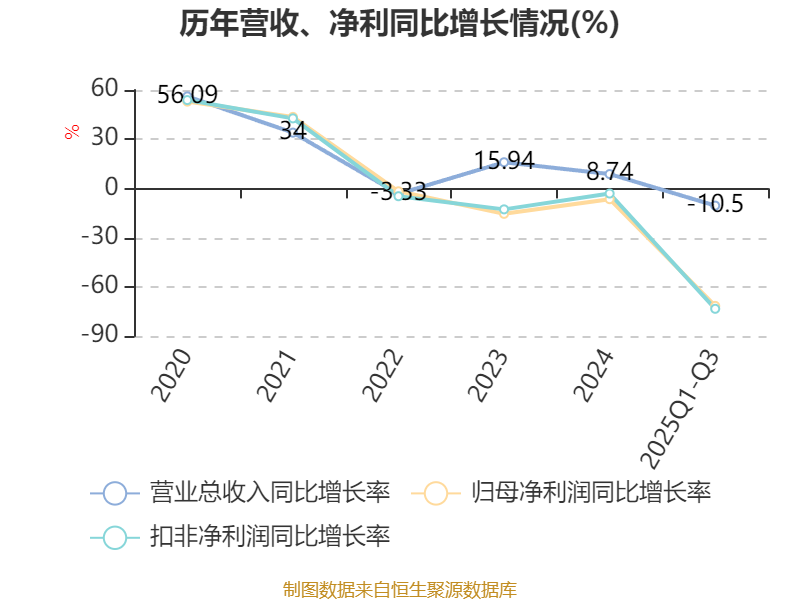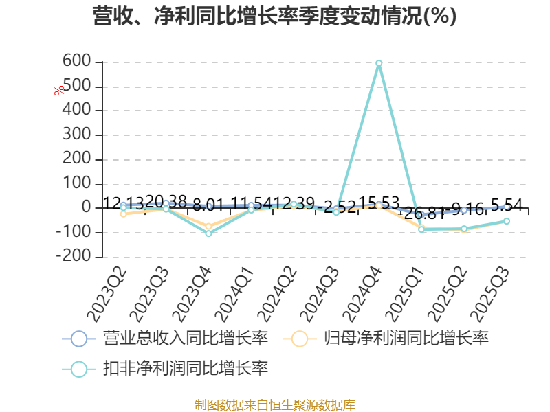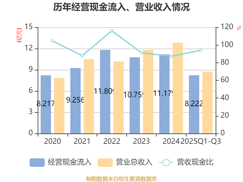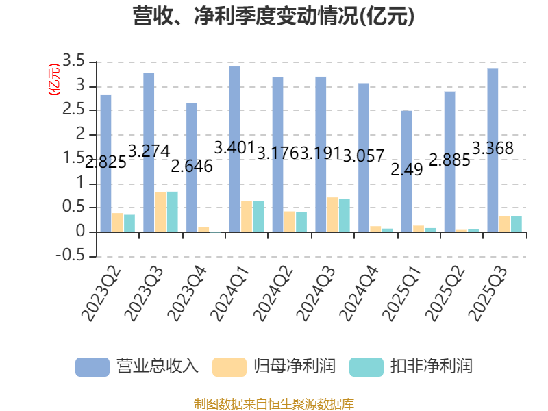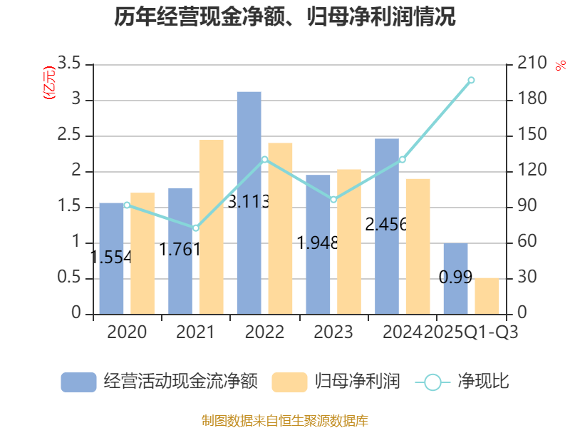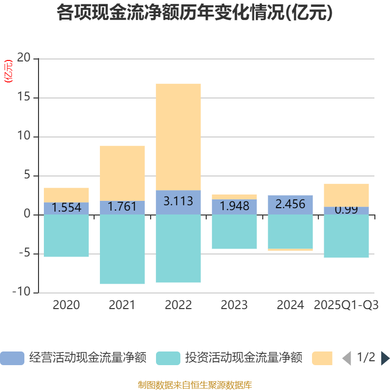 2025年前三季度,公司经营活动现金流净额为9895.49万元,同比下降17.25%;筹资活动现金流净额2.94亿元,同比增加4.67亿元;投资活动现金流净额-5.53亿元,上年同期为-4.25亿元。