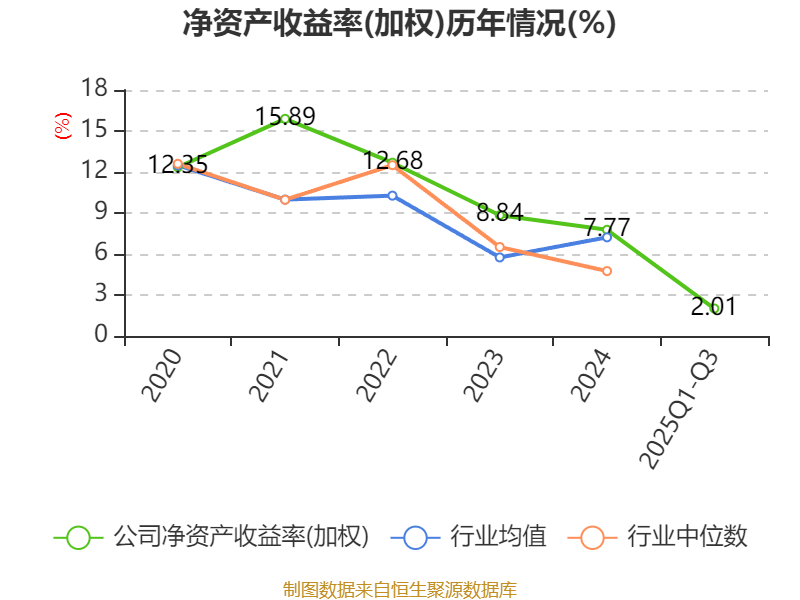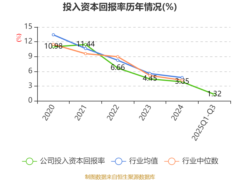 盈利能力方面, 2025年前三季度公司加权平均净资产收益率为2.01%,同比下降5.36个百分点。公司2025年前三季度投入资本回报率为1.32%,较上年同期下降2.49个百分点。