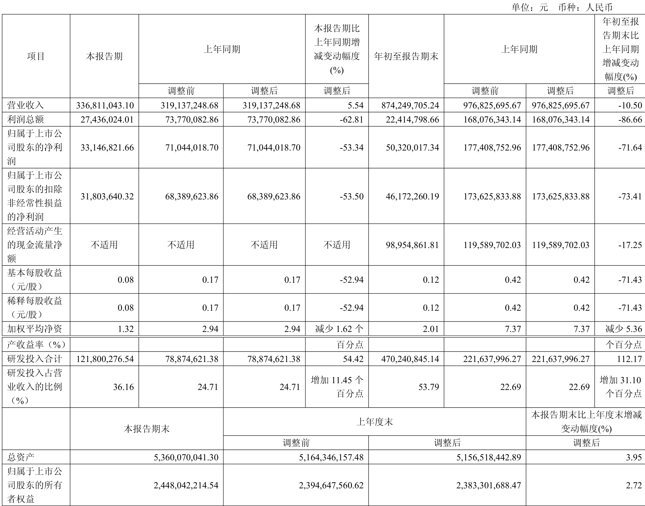 中证智能财讯博瑞医药(688166)10月31日披露2025年第三季度报告。前三季度公司实现营业总收入8.74亿元,同比下降10.50%;归母净利润5032万元,同比下降71.64%;扣非净利润4617.23万元,同比下降73.41%;经营活动产生的现金流量净额为9895.49万元,同比下降17.25%;报告期内,博瑞医药基本每股收益为0.12元,加权平均净资产收益率为2.01%。