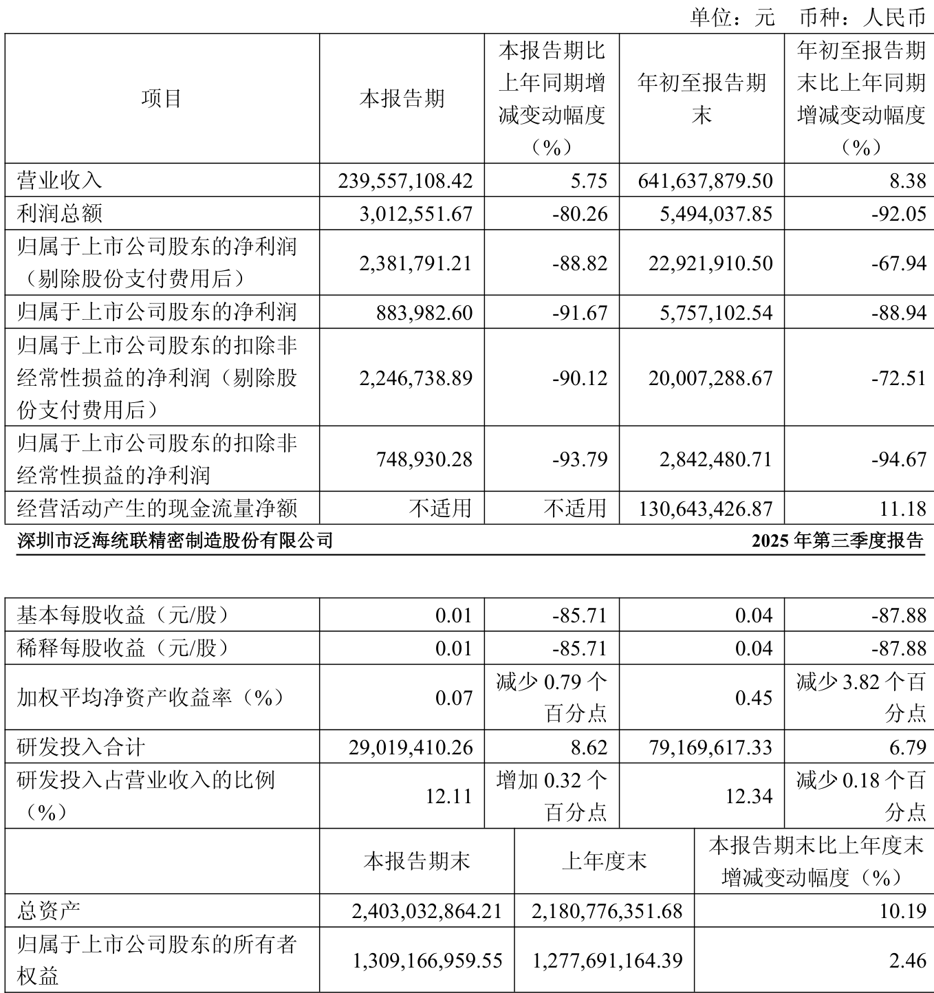 中证智能财讯统联精密(688210)10月31日披露2025年第三季度报告。前三季度公司实现营业总收入6.42亿元,同比增长8.38%;归母净利润575.71万元,同比下降88.94%;扣非净利润284.25万元,同比下降94.67%;经营活动产生的现金流量净额为1.31亿元,同比增长11.18%;报告期内,统联精密基本每股收益为0.04元,加权平均净资产收益率为0.45%。