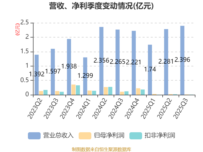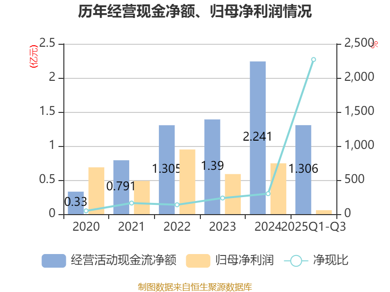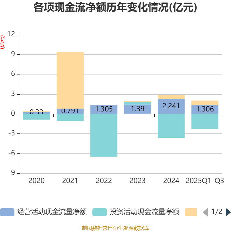 2025年前三季度,公司经营活动现金流净额为1.31亿元,同比增长11.18%;筹资活动现金流净额7008.89万元,同比减少2229.2万元;投资活动现金流净额-2.32亿元,上年同期为-2.62亿元。