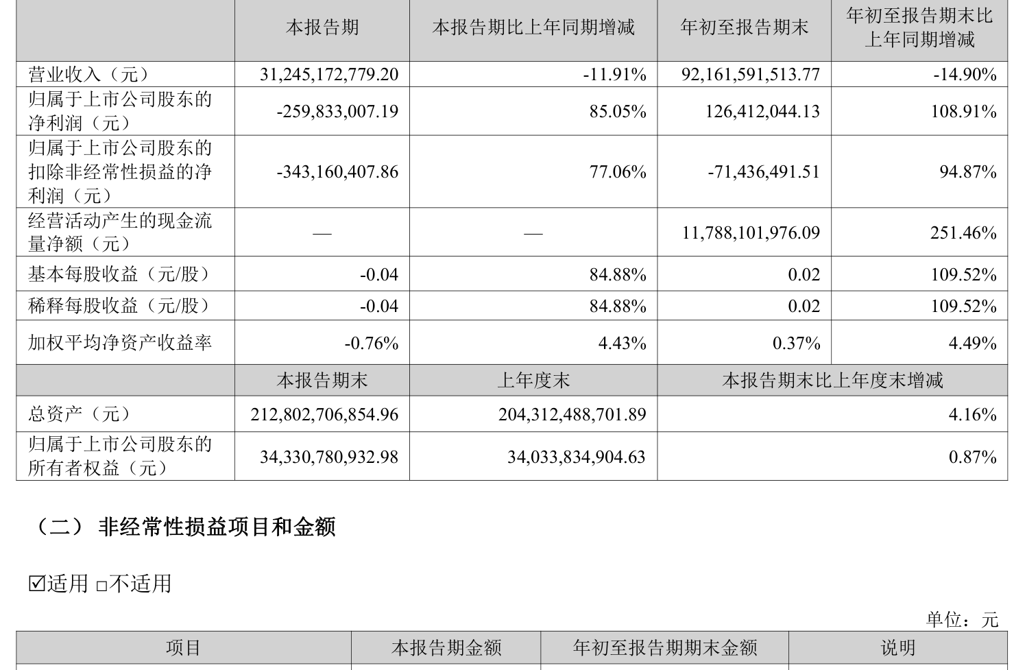 中证智能财讯东方盛虹(000301)10月31日披露2025年第三季度报告。前三季度公司实现营业总收入921.62亿元,同比下降14.90%;归母净利润1.26亿元,同比扭亏;扣非净利润亏损7143.65万元,上年同期亏损13.94亿元;经营活动产生的现金流量净额为117.88亿元,同比增长251.46%;报告期内,东方盛虹基本每股收益为0.02元,加权平均净资产收益率为0.37%。