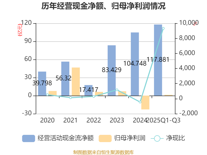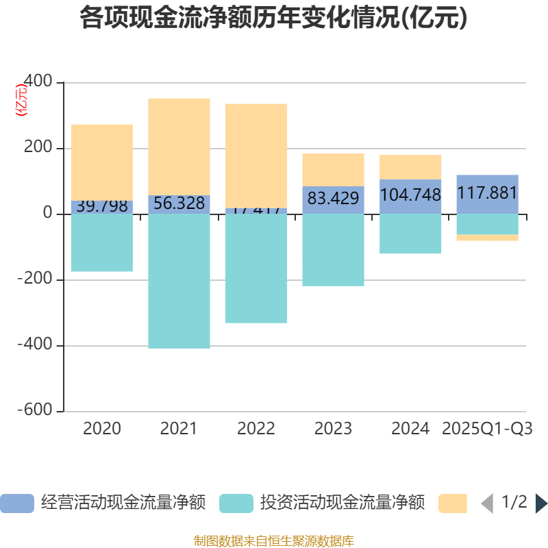 2025年前三季度,公司经营活动现金流净额为117.88亿元,同比增长251.46%;筹资活动现金流净额-18.4亿元,同比减少139.16亿元;投资活动现金流净额-63.84亿元,上年同期为-102.6亿元。