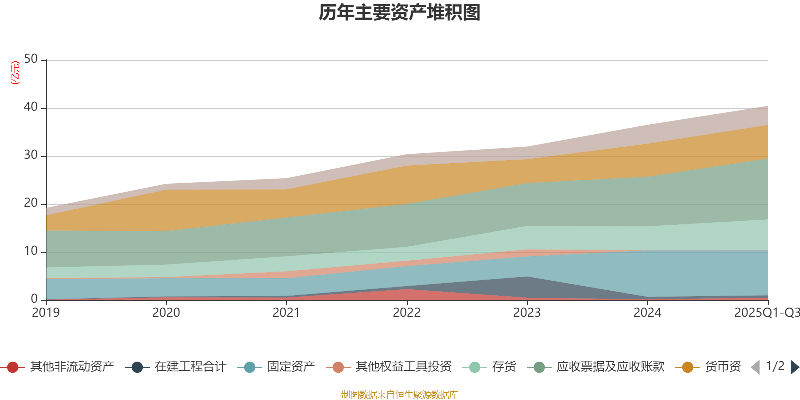 资产重大变化方面,截至2025年三季度末,公司固定资产较上年末减少3.53%,占公司总资产比重下降3.45个百分点;应收票据及应收账款较上年末增加22.55%,占公司总资产比重上升3.01个百分点;存货较上年末增加29.14%,占公司总资产比重上升2.25个百分点;长期股权投资较上年末减少42.11%,占公司总资产比重下降1.61个百分点。