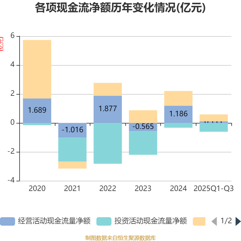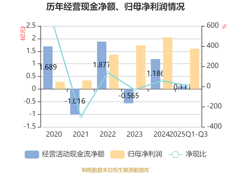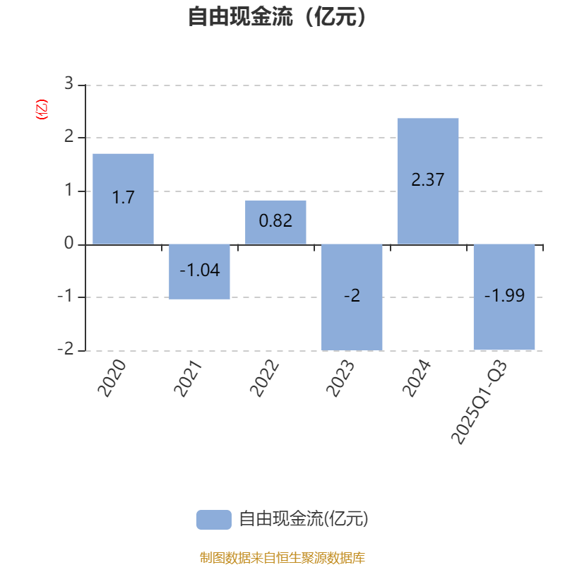 2025年前三季度,公司经营活动现金流净额为1110.23万元,同比增加6700.87万元;筹资活动现金流净额4746.36万元,同比减少6721.65万元;投资活动现金流净额-6095.31万元,上年同期为-1886.65万元。
