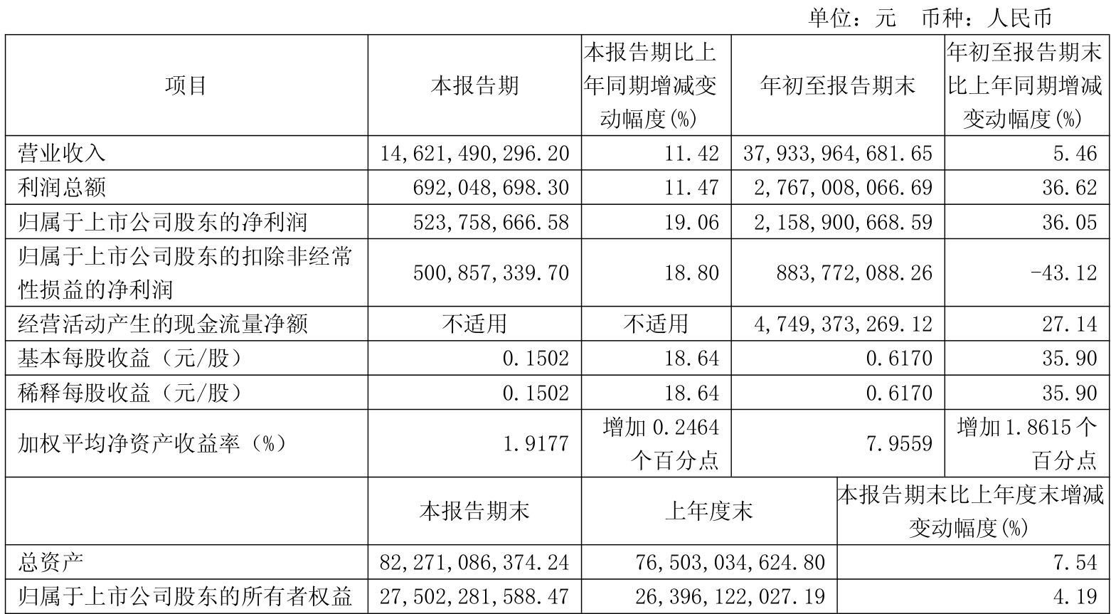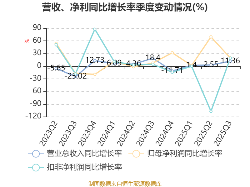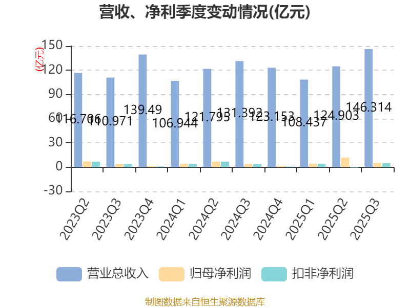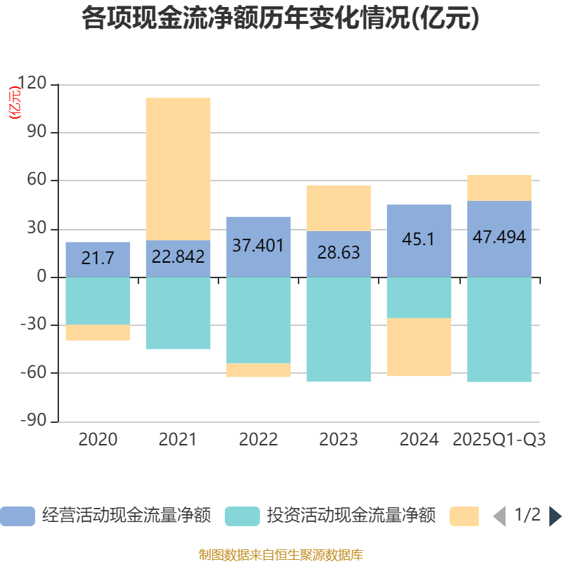 2025年前三季度,公司经营活动现金流净额为47.49亿元,同比增长27.14%;筹资活动现金流净额16.03亿元,同比增加16.88亿元;投资活动现金流净额-65.35亿元,上年同期为-24.22亿元。